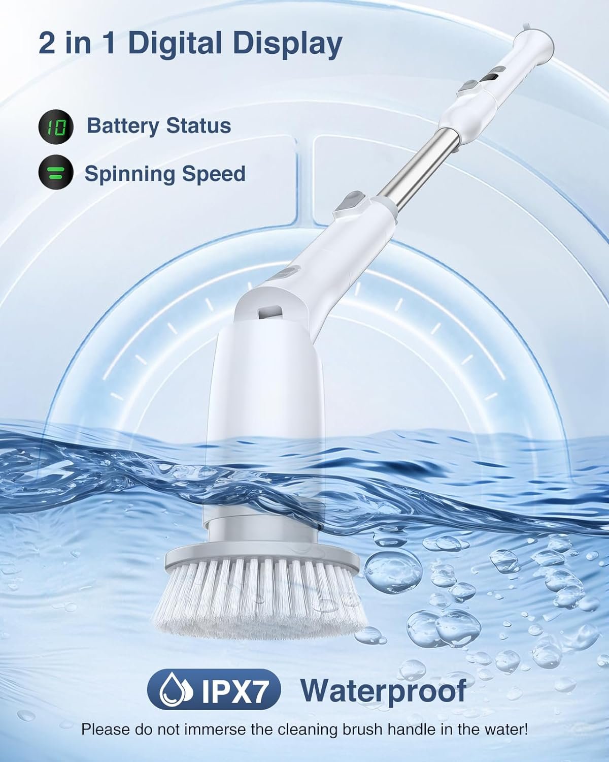 ☔[𝐖𝐚𝐭𝐞𝐫𝐩𝐫𝐨𝐨𝐟 & 𝐖𝐢𝐝𝐞 𝐀𝐩𝐩𝐥𝐢𝐜𝐚𝐭𝐢𝐨𝐧𝐬] IPX7 waterproof ensures daily safe use of this electric scrubber, with no worry about splashes. Perfect for cleaning bathroom, shower, tub, toilet, sink, car, kitchen, grout, tile, etc. (Note: please do not immerse the cleaning brush handle in the water! )