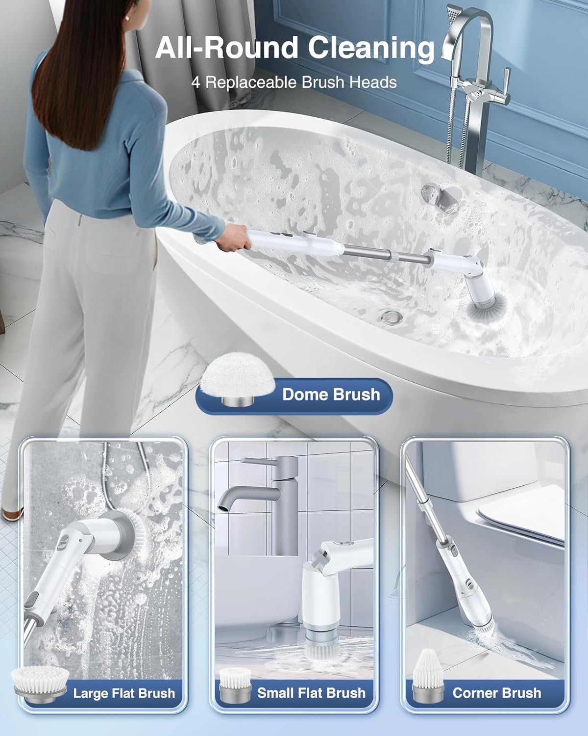 🛀[𝐖𝐢𝐭𝐡 𝟒 𝐇𝐢𝐠𝐡-𝐪𝐮𝐚𝐥𝐢𝐭𝐲 𝐑𝐞𝐩𝐥𝐚𝐜𝐞𝐚𝐛𝐥𝐞 𝐁𝐫𝐮𝐬𝐡 𝐇𝐞𝐚𝐝𝐬] Hymeago cordless spin scrubber comes with 4 detachable brushes to satisfy your different cleaning needs. ①Dome brush, ideal for concave areas like bathtubs and sinks; ②Large flat brush, suitable for flat surface areas like hard floors and tiles; ③Corner brush, great for narrow and hard-to-reach areas like corners and gaps; ④Small flat brush, perfect for smaller areas like stove and counter.