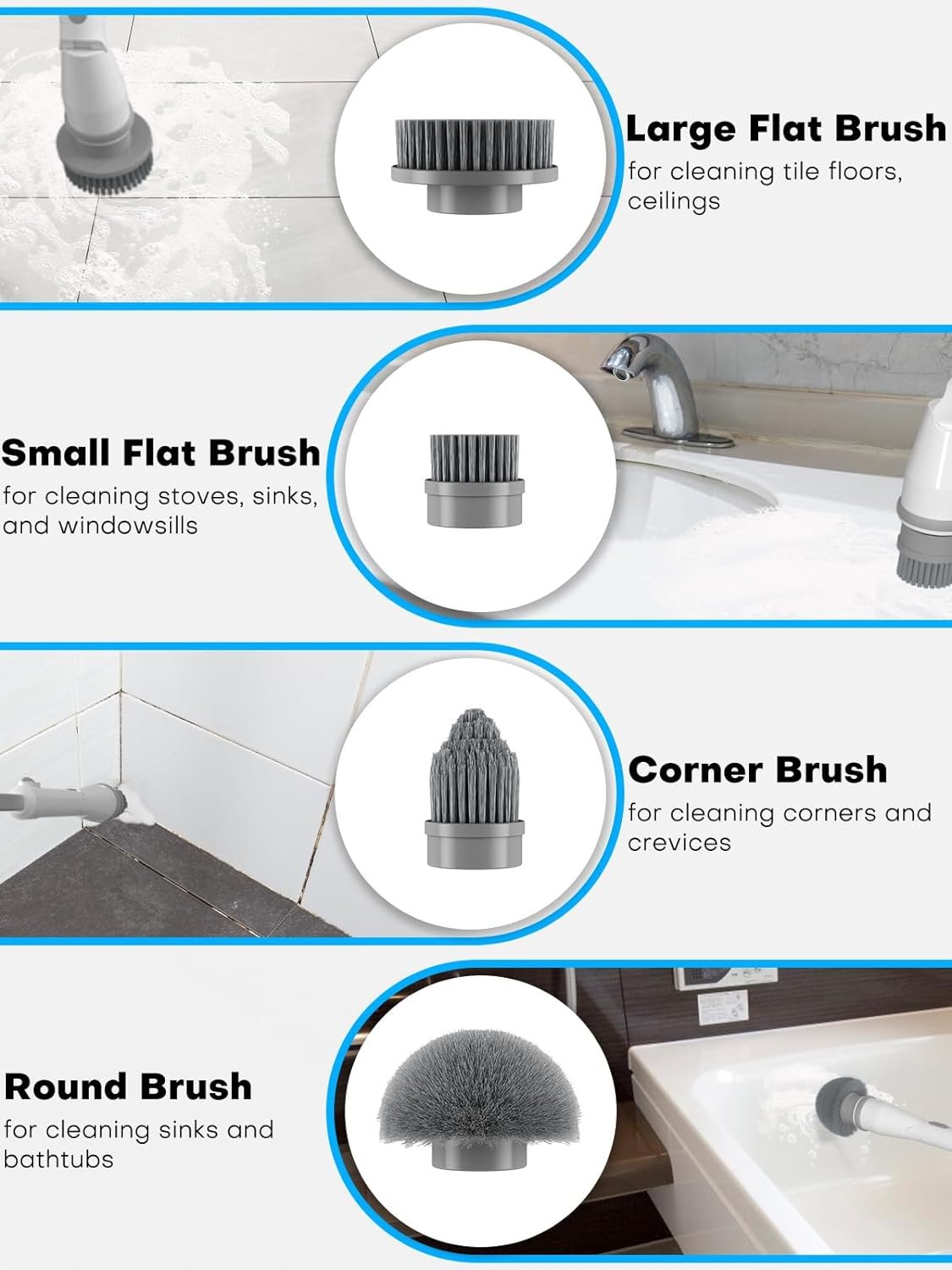 🧹 Versatile Cleaning Set: The electric spin scrubber comes with a set of four brushes that are designed for specific areas. It includes a stiff and flat brush for cleaning large surfaces, a corner brush for cleaning curved areas, a small and flat brush for detailed work, and a pointed brush for cleaning gaps. All the brushes have long-lasting bristles that won’t scratch surfaces. With this comprehensive set, you can be sure that every nook and cranny will be thoroughly cleaned.