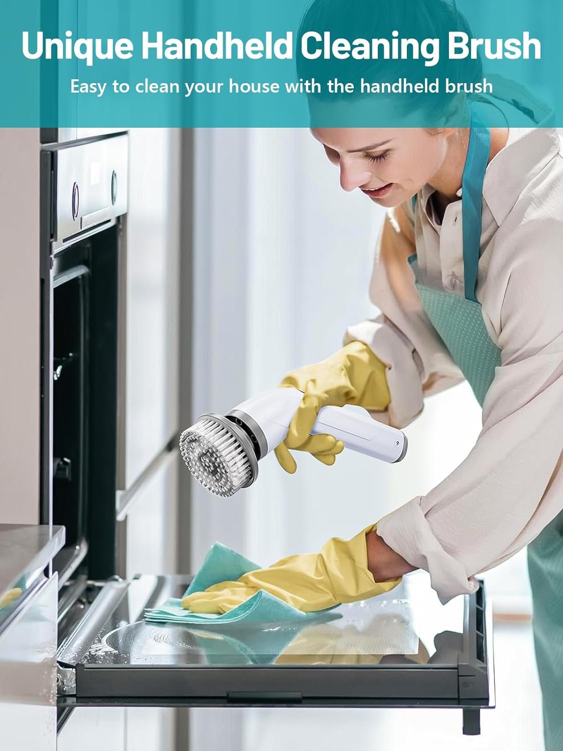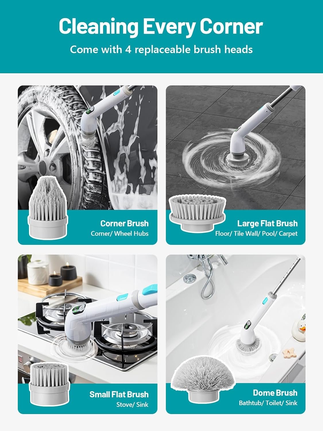 4 Multi-purpose Brush Heads – The electric scrubber has 4 brush heads, which cater to all cleaning areas in kitchens and bathrooms. Dome brush, for cleaning concave areas like bathtubs and sinks; Corner brush, suitable for cleaning narrow and hard-to-reach areas like corners and gaps; Big flat brush for effortlessly cleaning grounds, glass, doors, and walls; Small flat brush is designed for stoves, grout, and countertops.