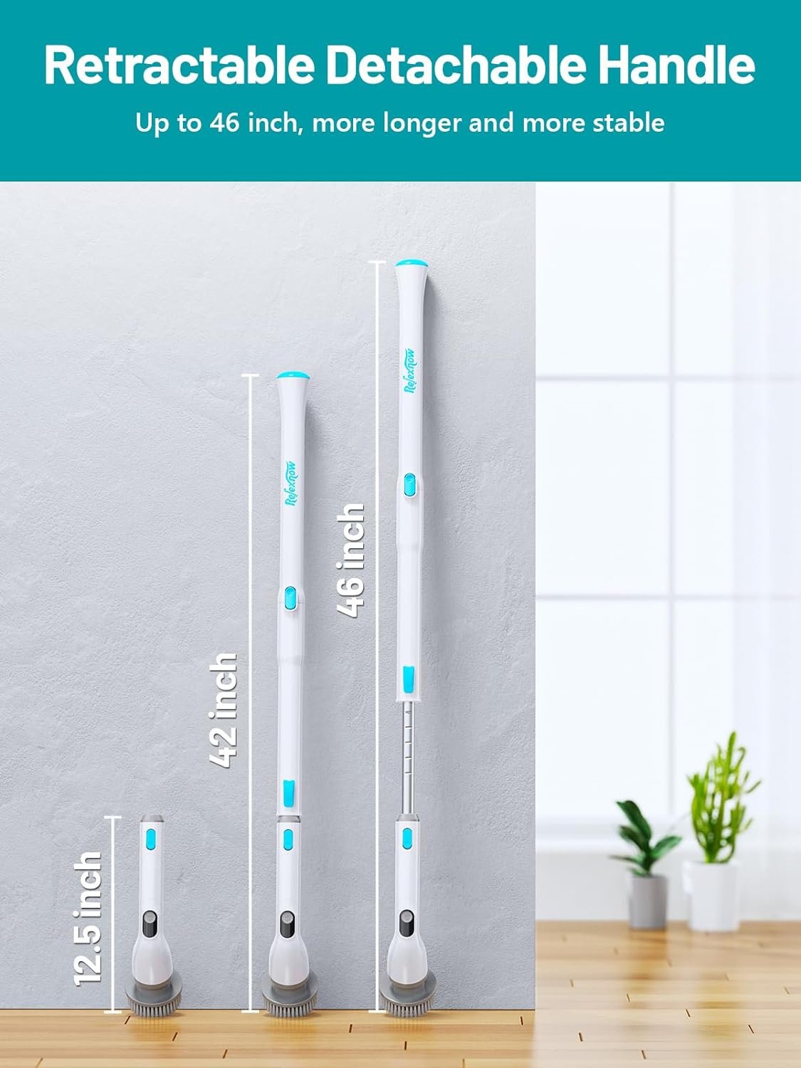 3 Adjustable Length – Featuring three adjustable lengths, the bathtub scrubber can be easily modified to 12.5 inches, 42 inches, or 46 inches to be used for different reach ranges cleaning tasks. The front-positioned battery allows standalone use of the short handle, you can do more cleaning with the unique short handle.