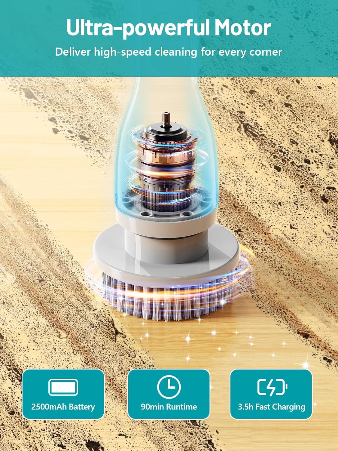 Full-Body IPX7 High-Power Scrubber – Powered by a 2500mAh battery and USB type-c fast charging technology, the floor scrubber machine can ensure strong power output and up to 90 minutes of uninterrupted cleaning. The entire machine is IPX7 waterproof, which ensures daily safe use and a longer lifetime. Note: We recommend the soaking time of the scrubber brush should within 30 minutes.