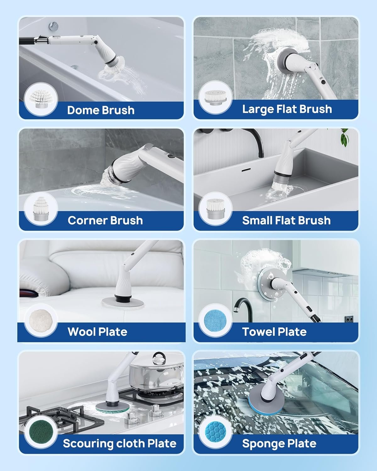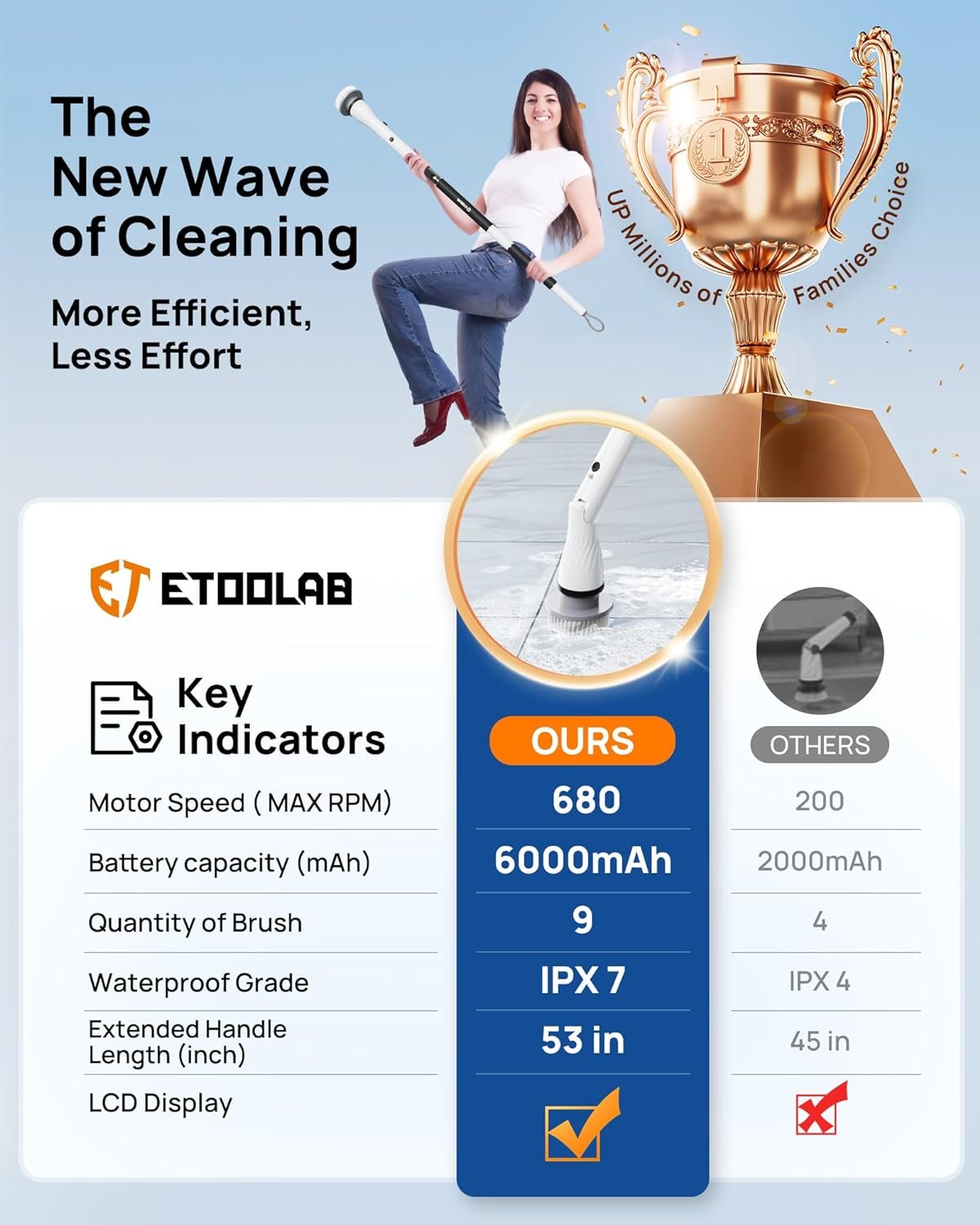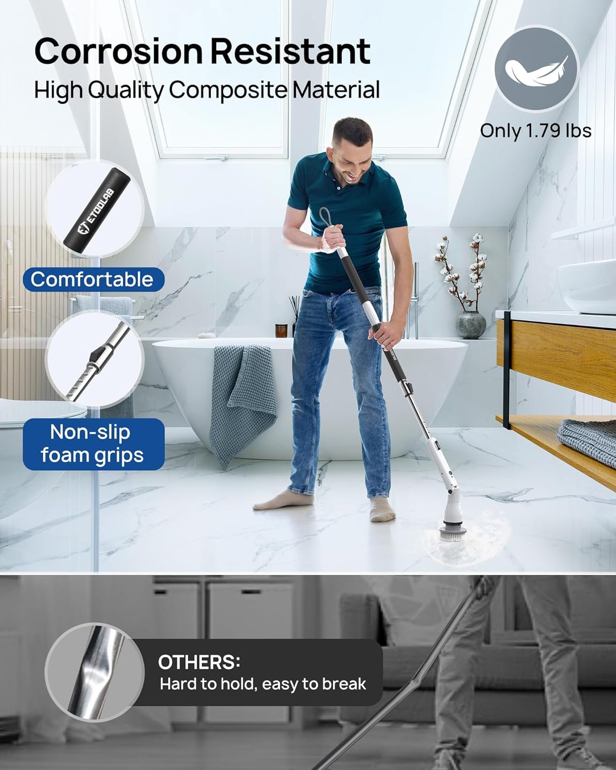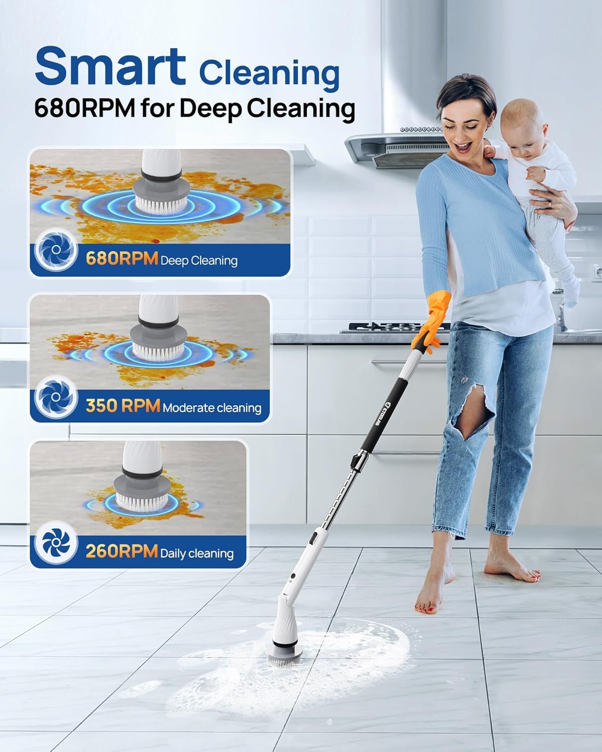 【Easier and Faster】 ETOOLAB power scrubber equipped with 3 speed powerful motor, drives the rotating brush head to rotate at a high speed up to 680RPM, making it perfect for cleaning shower bathrooms, bath tubs, stone tile floors, grout, grooves; When used with a cleaning agent, it can quickly clean stubborn stains and make your home look new!