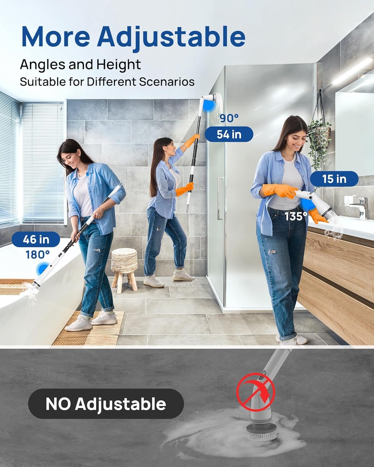 【3 Adjustable Speeds & 3 Adjustable Angles】 The bathroom scrubber electric has 3 adjustable spin speeds(260RPM/350RPM/680RMP) and 3 adjustable angles (90°, 135°, 180°), which makes it perfect for tackling tough cleaning tasks in your bathroom, bathtub, stone tile floors, grout, grooves, and toilets.