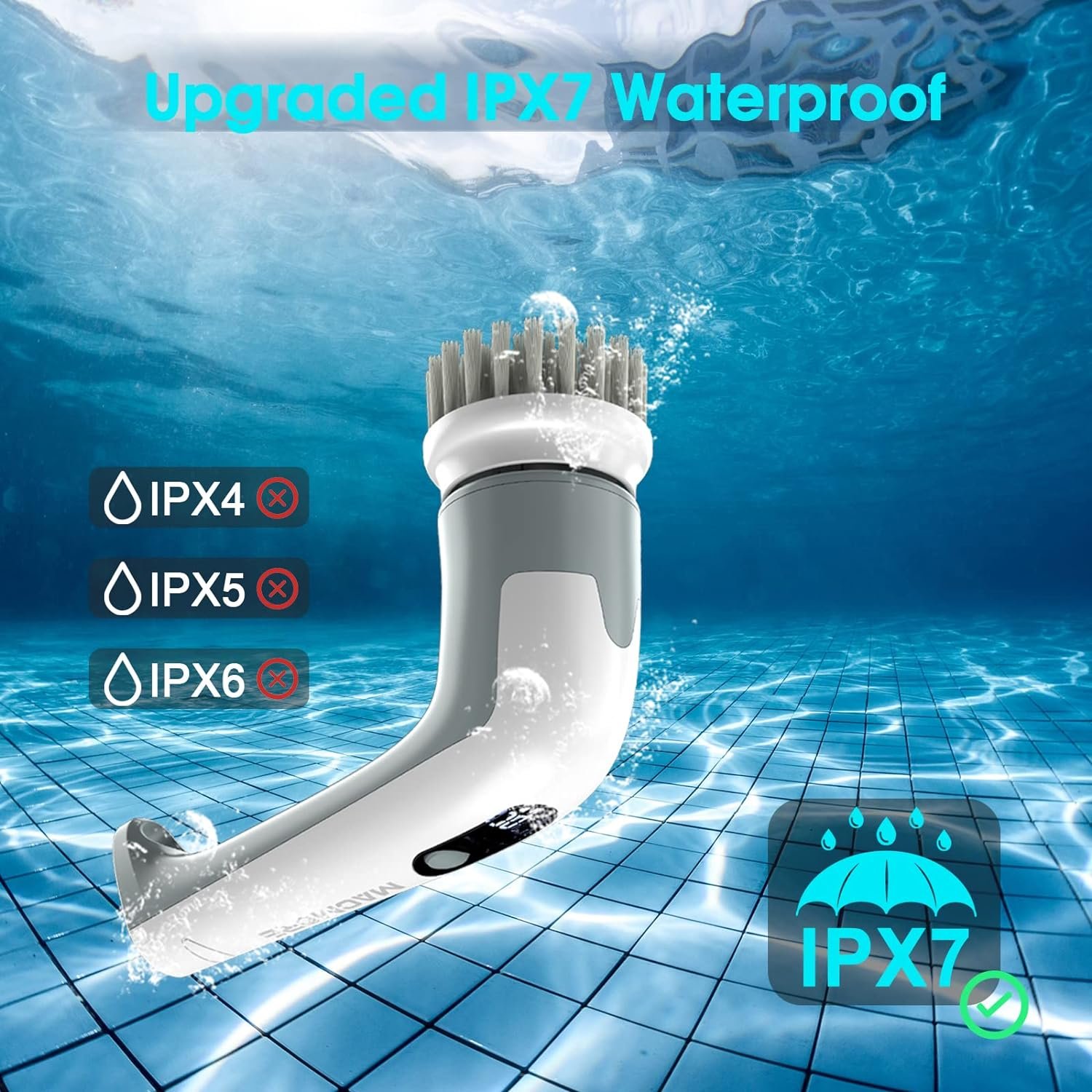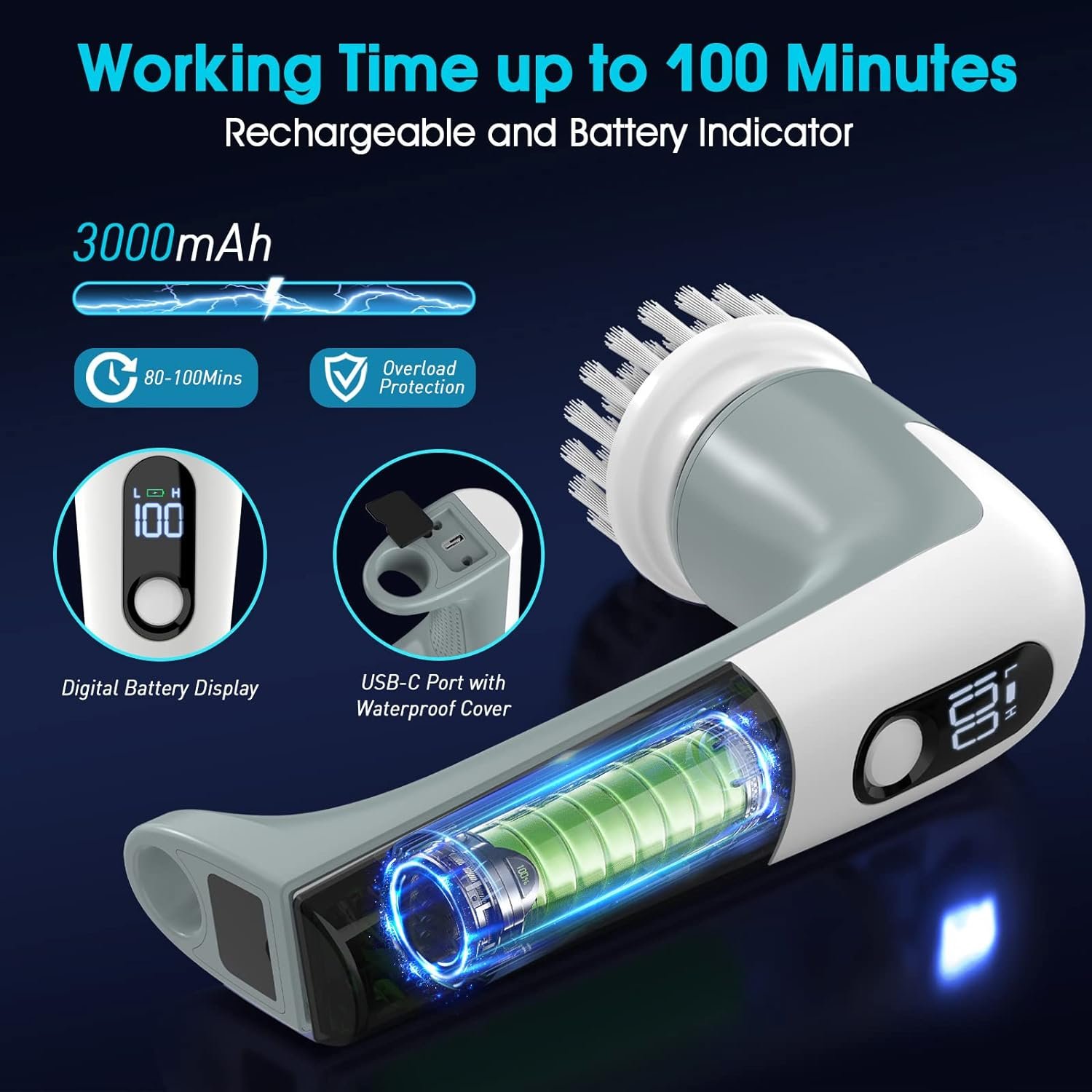 100Mins Long Working Time & LCD Battery Display – With a 3000mAh large-capacity battery, this bathroom scrubber can work for up to 100 minutes and be recharged from USB-C port cable(included). LCD screen lets you know the percentage charge it has and when it is time to charge, taking the guesswork out. Also design with IPX7 waterproof function, the spin power scrubber can work normally even in less than 1-meter deep water, while the rubber USB connector cover did a good job keeping the water out