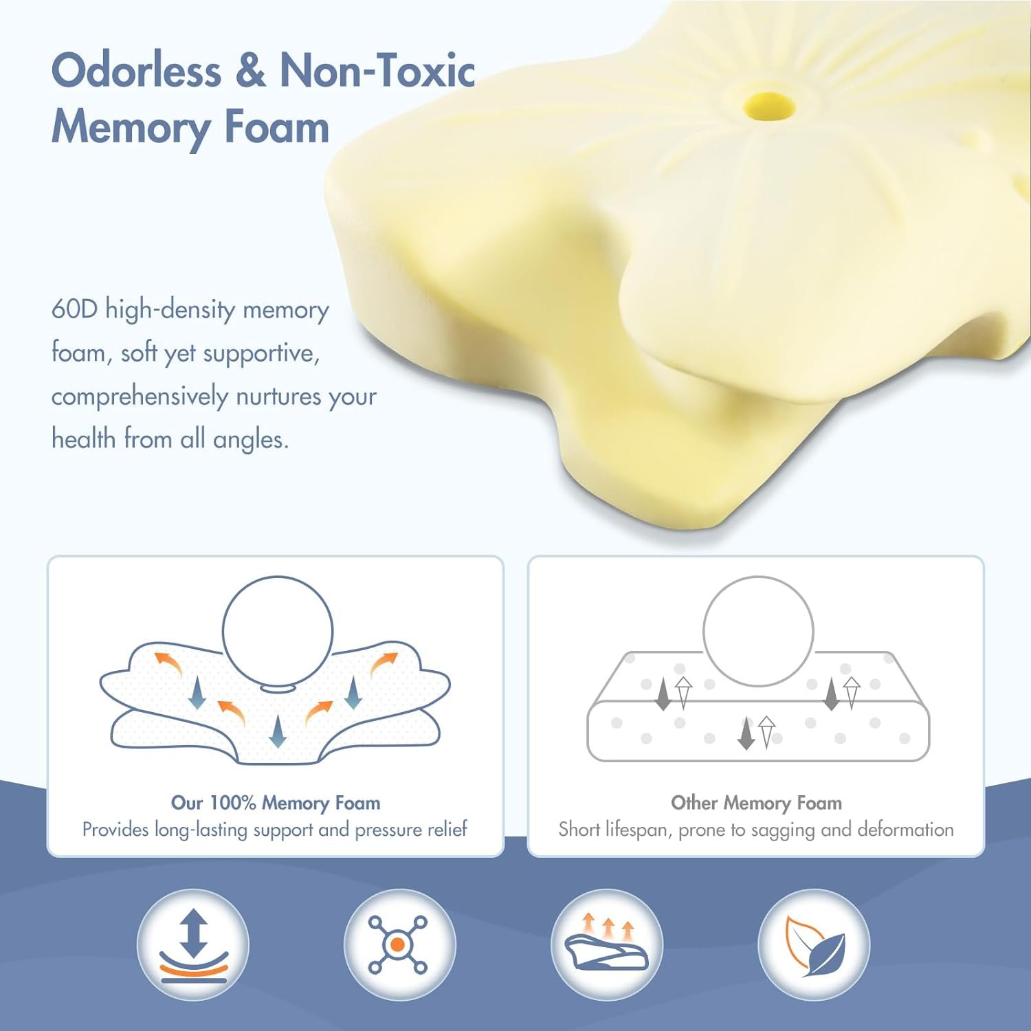 π§γ3-5s Slow Rebound & Zero Pressure 60D Memory FoamγElegear cervical pillow for neck pain reliefis is made of 60D high-density memory foam, soft yet supportive, comprehens ively nurtures your health from all angles. Our 100% Memory Foam provides long-lasting support and pressure relief. The memory foam neck pillow has the characteristics of slow rebound, which can effectively absorb the impact force, release the pressure evenly, and provide you with a super supportive feeling.