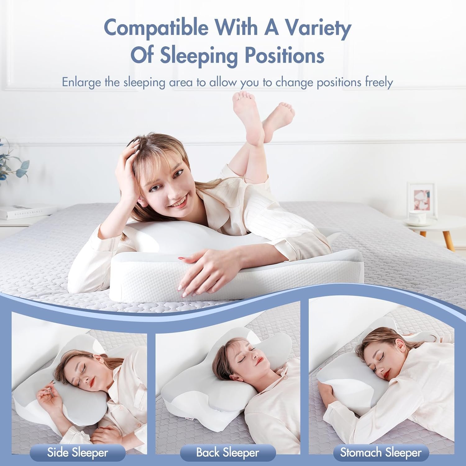 π§γFree Sleeping Position & No Stiff NeckγThe Cervical Pillow for Neck Pain Relief is compatible with a variety of sleeping positions, perfect for back sleeperοΌFits the physiological curvature of the cervical spineοΌ, side sleeper οΌFits the contours of the face without compressing the face or earsοΌand stomach sleeperοΌSupport your arms and sleep comfortably on your backοΌ. Optimized pillow surface design, expanding sleeping area, allowing you to change positions as you please. No more worrying about stiff neck!
