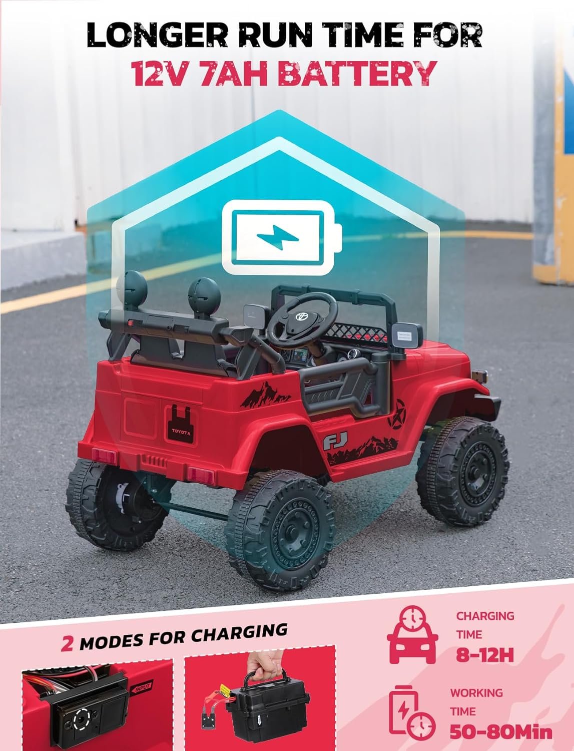 【12V7AH Battery Car for Kids】Compared to most single seat electric kids car on the market, this 12V ride on toys come with 7AH battery for longer working time. Not only that, the newly upgraded low-battery voice prompt will remind you that you need to charge when the battery is running out. (Charging time: 8-12H)