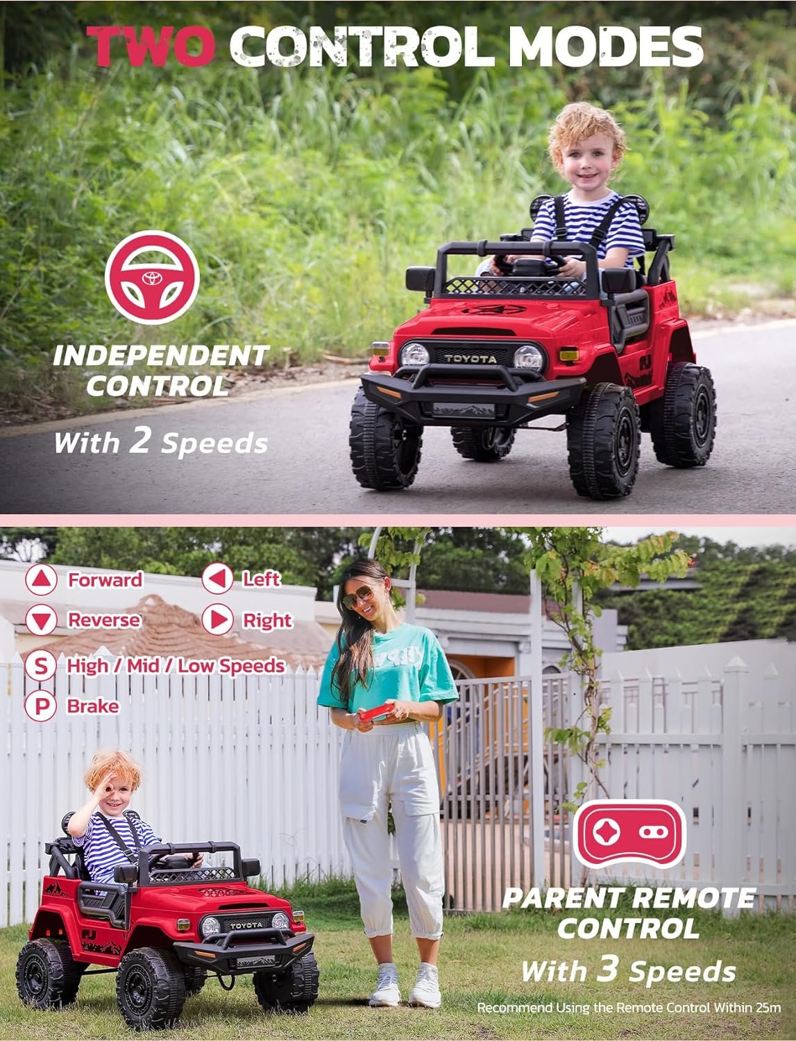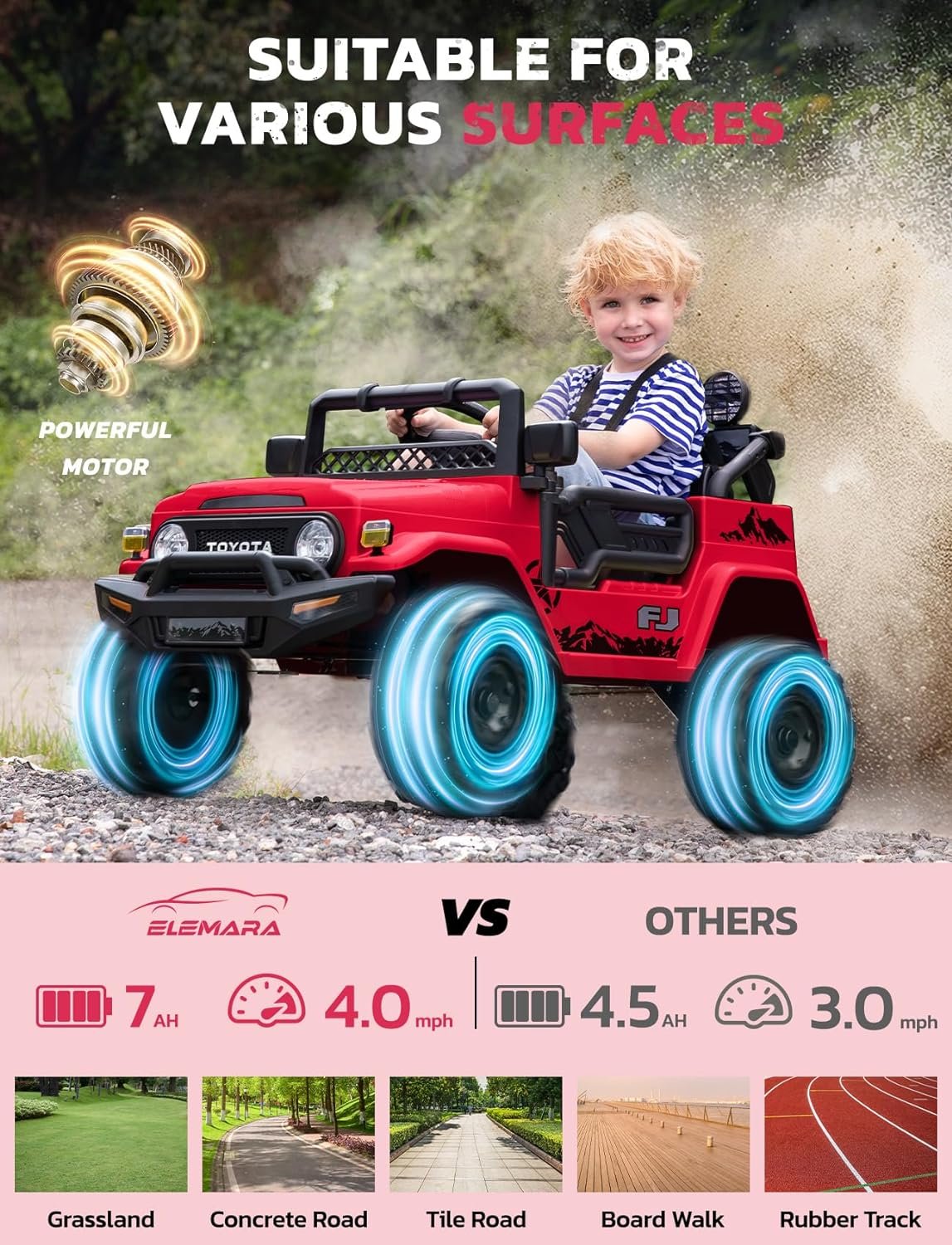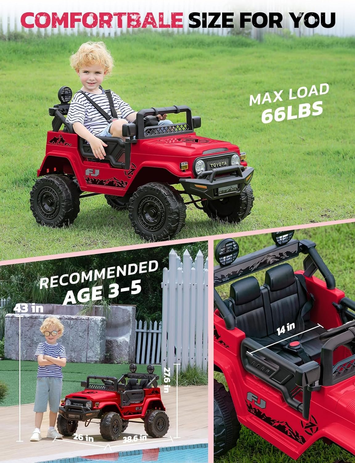 【Officially Licensed Toyota FJ40】ELEMARA ride on car adopted 1:1 reproduction of Toyota FJ40 off-road vehicle. Classic but cool appearance. Designed with 6 LED lights, MP3 player, Bluetooth, USB por. Suitable for ride on all terrains to bring a realistic and funny driving experience for your kids!