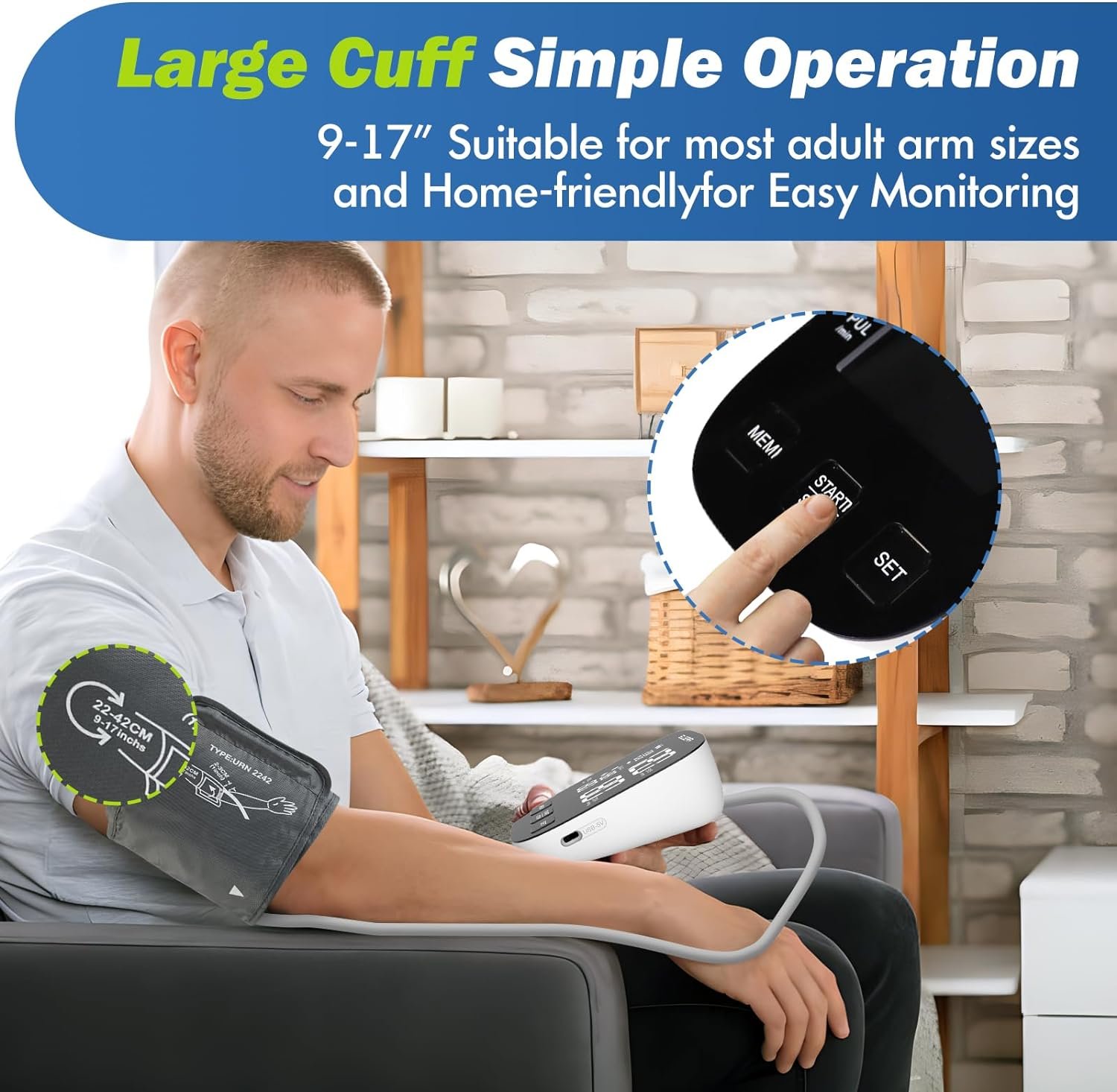 COMFORTABLE LARGE CUFF: Our blood pressure monitor comes with an adjustable universal-sized cuff 9-17 inches/22-42cm) suitable for most arms, providing a better fit and improved readings. Using a blood pressure monitor at home has never been more convenient and straightforward.