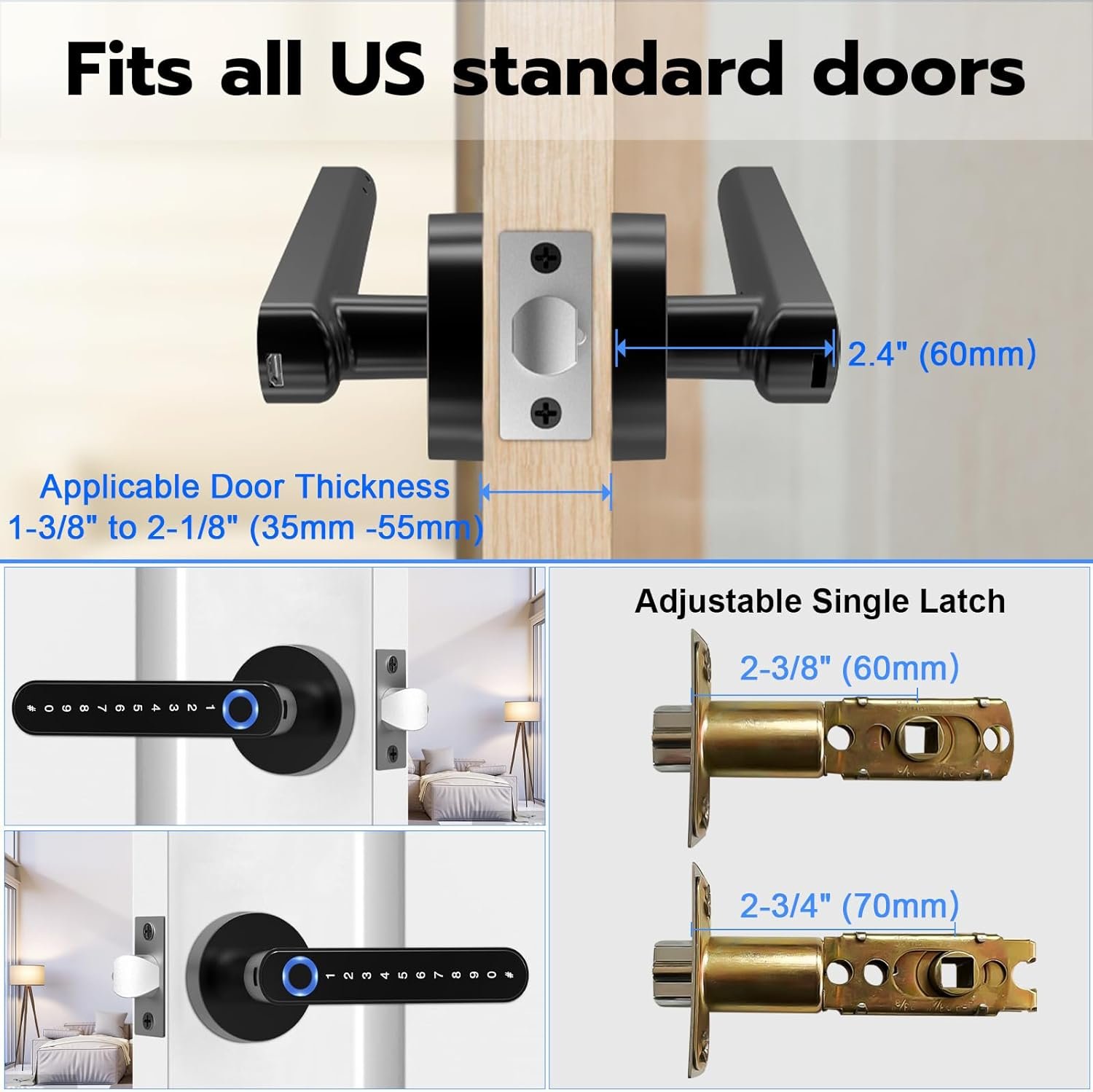 đăEasy to InstallăReplaces most standard U.S ball door knob locks, no need to re-punch, installs in minutes. Suitable for all doors thickness about 1.2 ~2.56 inches (30~70mm). Adjustable backset 2.36 /2.76 inches (60/70mm), Suitable for both left and right-handed doors.