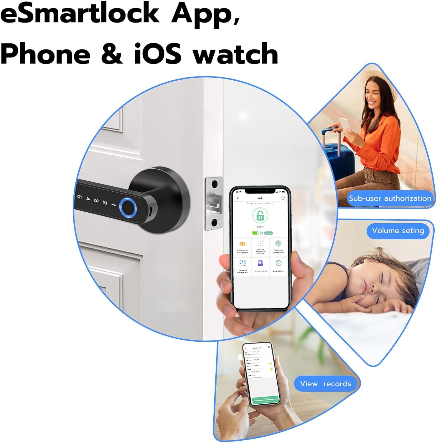 đăeSmartLock AppăSupport Phone & iOS Watch, Bluetooth connect, set voice volume of door lock, vacation mode, view unlock records. You can Add 1 admin and 1000+ general users. Admin can authorize your family/friends/colleagues to unlock, set the sub-accountâs unlock period and schedule, efficient group management.
