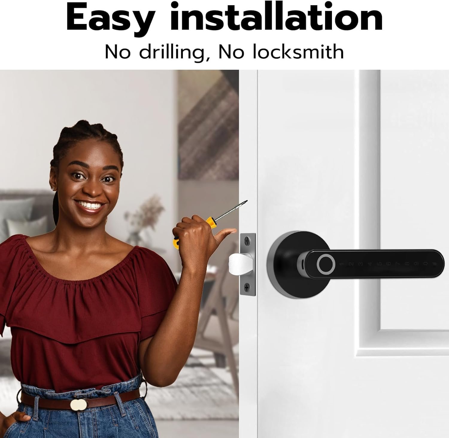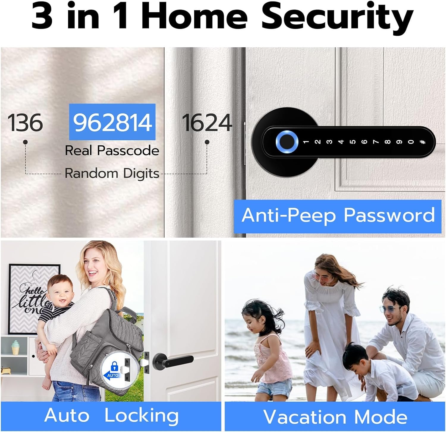 đăFingerprint Door LockăUnlock your door in a single motion – by scanning your fingerprints as you grip the door handle. Your finger is the key, and it only takes 0.1 second unlock it. The smart entry door lock can record up to 100 different fingerprints.Enlarged fingerprint sensor makes it easier to recognize your fingers.