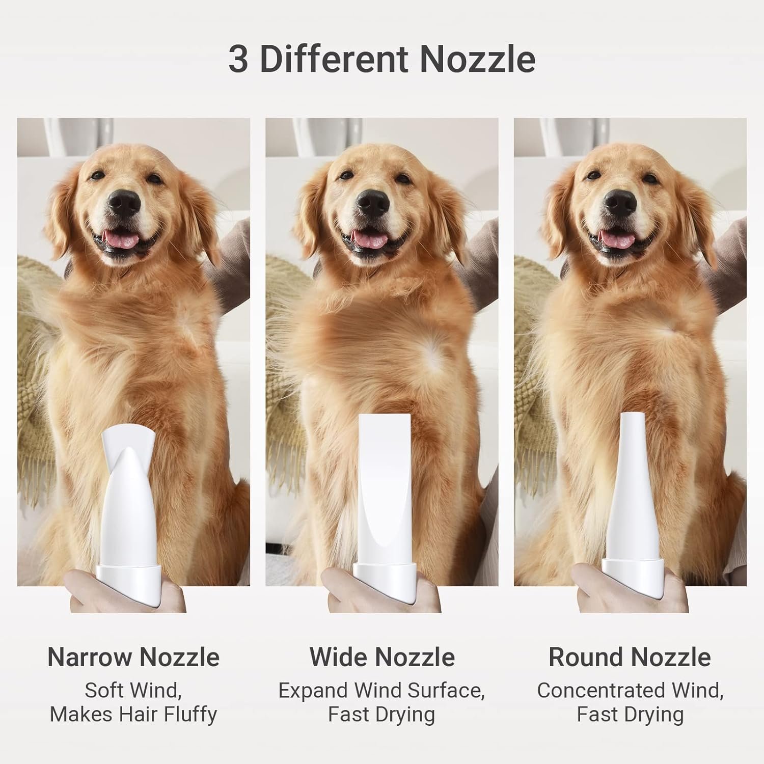 【Multifunctional Use】 Our pet blow dryer is equipped with 3 different nozzles to meet different drying needs for different pets. In addition, the dog cat hair dryer can also be used to dry your car, floors, furniture, etc. It can meet your various needs