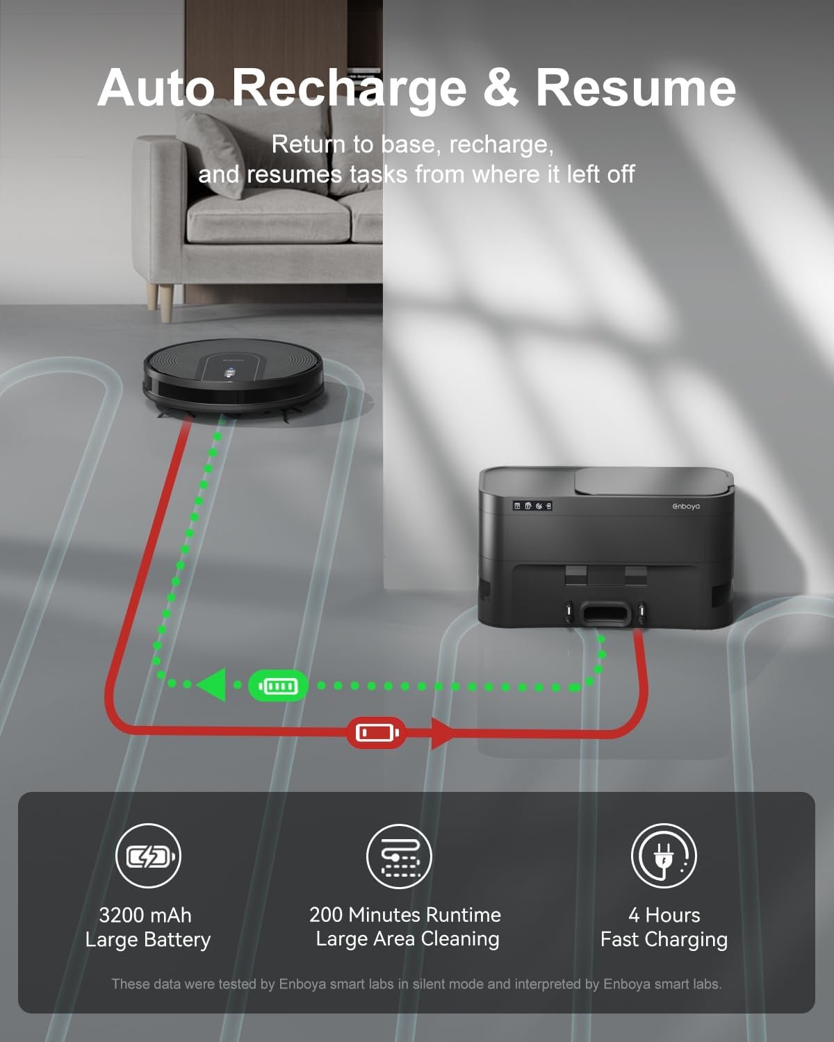[๐๐จ๐ง๐ ๐๐๐ญ๐ญ๐๐ซ๐ฒ ๐๐ข๐๐ & ๐๐ฎ๐ญ๐จ ๐๐๐๐ก๐๐ซ๐ ๐ข๐ง๐ ]: Fast charging takes only 4 hours to go from empty to full. A single cleaning session provides 200 minutes of runtime, sufficient to meet the needs of most households. If the robotic vacuum has completed its cleaning path or runs out of battery during the cleaning process, it will automatically return to the self-emptying base for recharging.