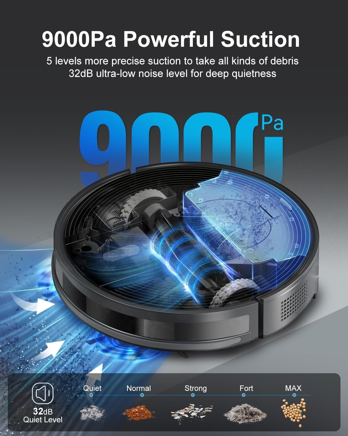[๐๐จ๐ฐ๐๐ซ๐๐ฎ๐ฅ ๐๐ฎ๐๐ญ๐ข๐จ๐ง & ๐๐จ๐ฐ ๐๐จ๐ข๐ฌ๐]: The Enboya robotic vacuum cleaner boasts a maximum suction power of 9000PA, effortlessly tackling dust, debris, and pet hair on various types of floors, delivering a comprehensive and impeccable cleaning experience. In quiet mode, the noise is as low as 32dB, allowing for quick cleaning of dirty rooms even while children are asleep.
