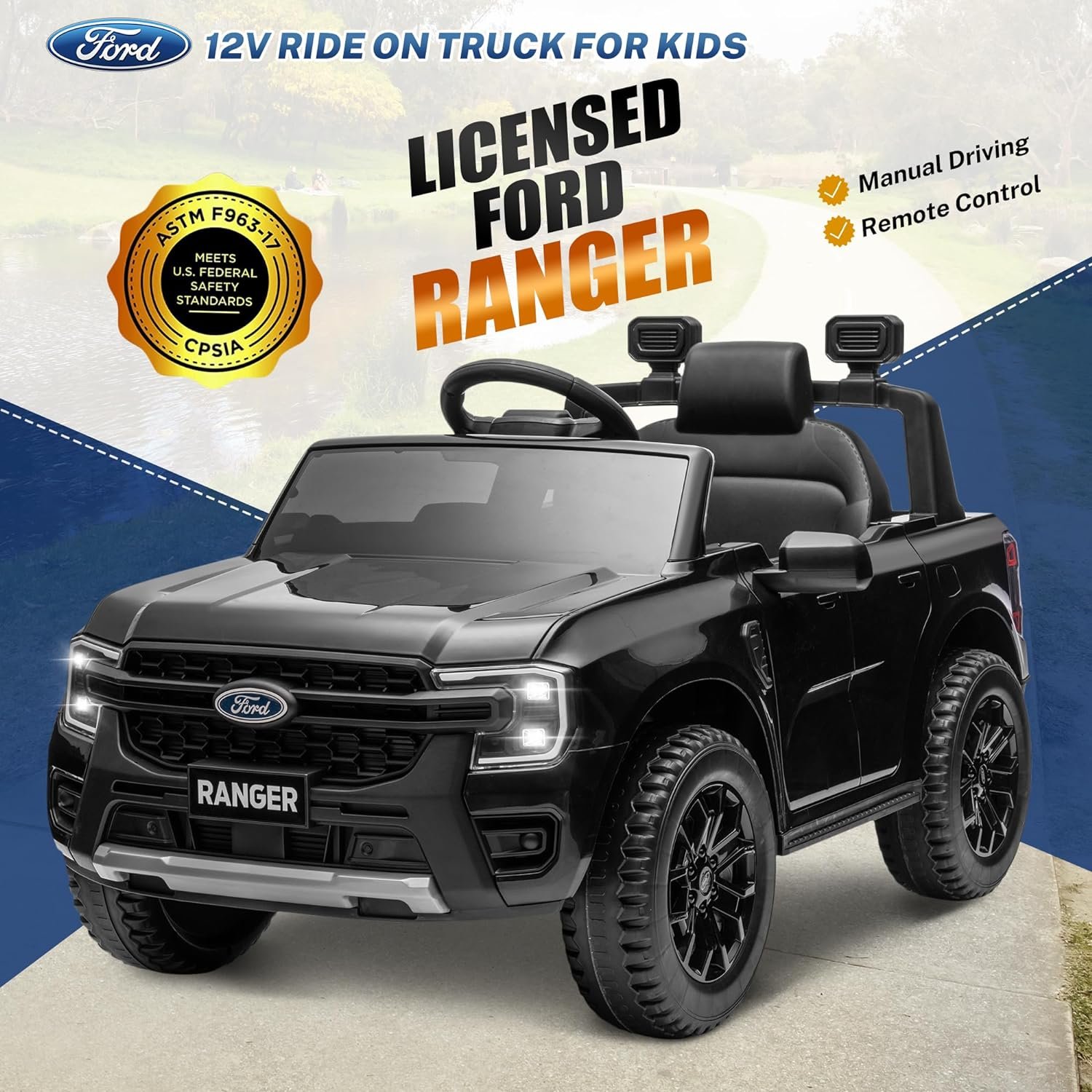 [PERFECTLY SIZED]: Introducing this 12V kids electric vehicle, a licensed and scaled-down version of the Ford Ranger truck, designed specifically for children ages 37-72 Months. This ride-on can support up to 66 pounds and features steering wheel and foot pedal controls, so your little ones can have a fun-sized ride.