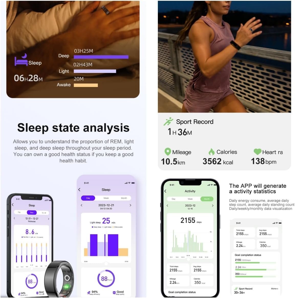 【20 Exercise Modes and Fitness Tracker】The Smart Health Ring tracks your activities throughout the day with high precision. For example, the Fitness Ring tracks your steps, distance walked and calories burned. In addition, the Smart Ring features different exercise modes such as walking, running and cycling. The ring tracks and scores your activities to encourage a more active lifestyle!