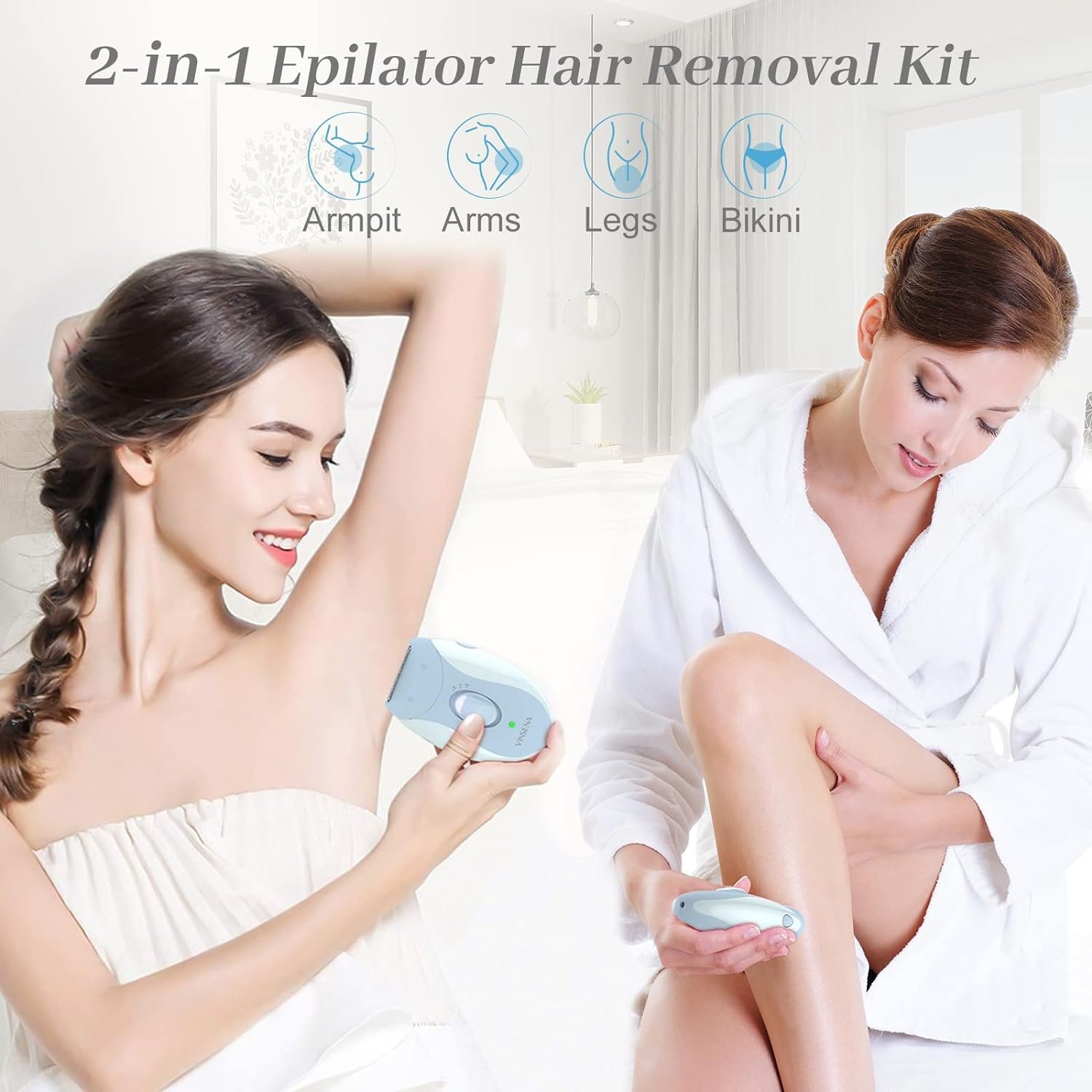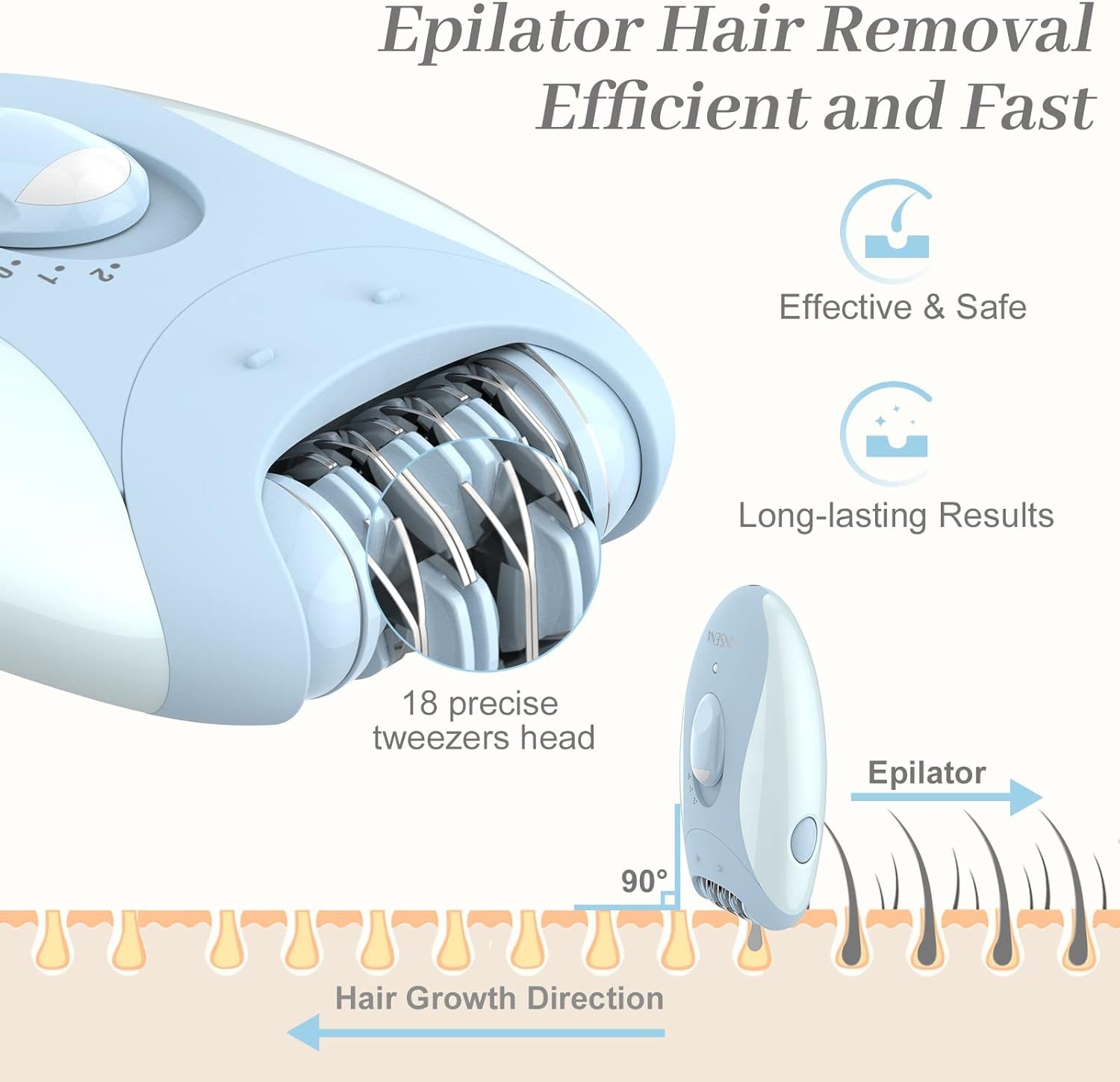 🏄♀Effective Electric Epilator – Cordless epilator rotating 18 tweezers quickly removes unwanted hair from the root, giving you smooth skin long-lasting for up to 4 weeks. Keeping the hair and the epilator at 90°for depilation helps to do more efficient and more careful complete hair removal.