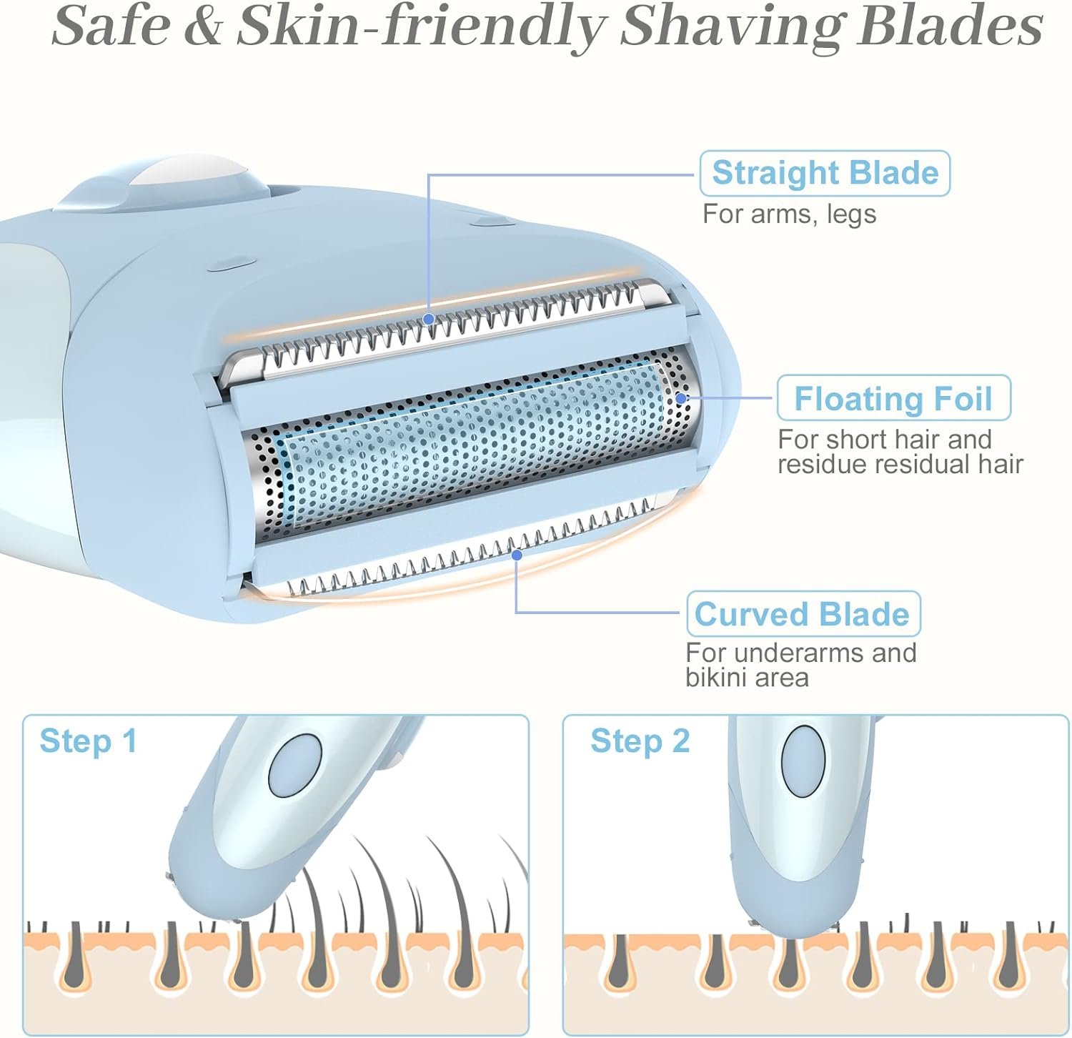 🌴Painless Floating Foil Head – The women’s electric shaver features skin-friendly stainless steel blades, that fit the contours of your body and glide gently along your body curves & contours. Skin-friendly and painless hair shaving, without irritation worries on sensitive skin.