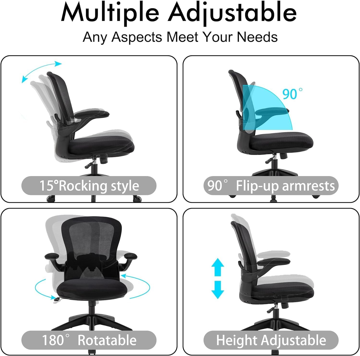 【Excellent design】This ergonomic office chair has a mesh backrest, 4 inches thick foam cushion, adjustable lumbar support, and liftable armrests and the base of this computer chair allows for 360° rotation and sliding. The home office chair can be adjusted to different heights, making it suitable for people of different heights.