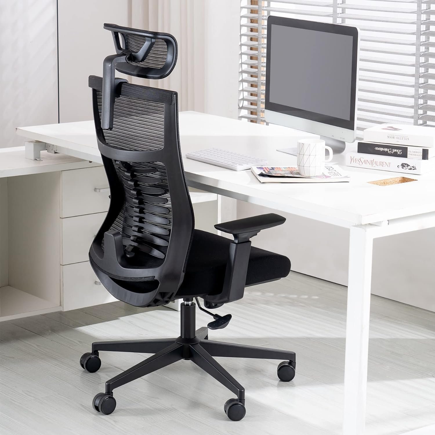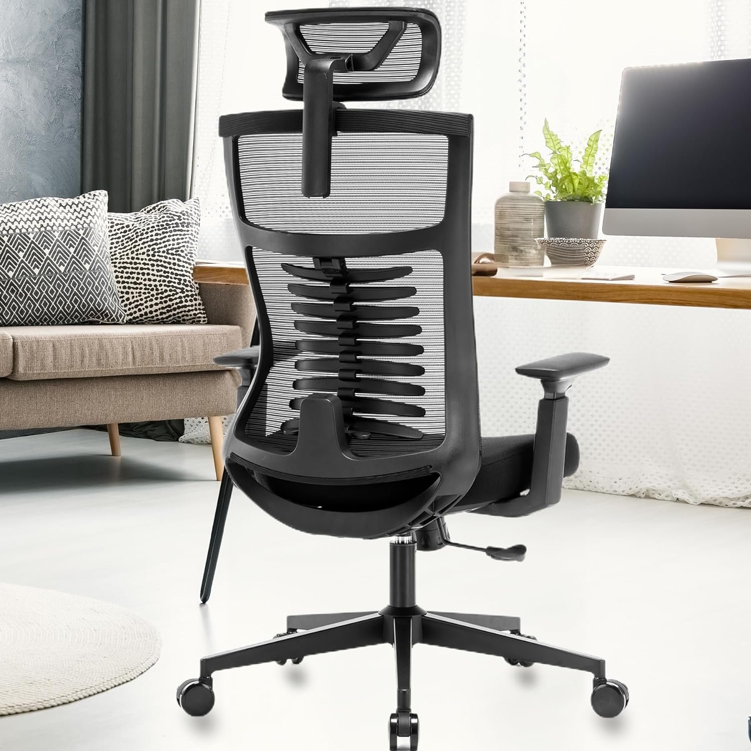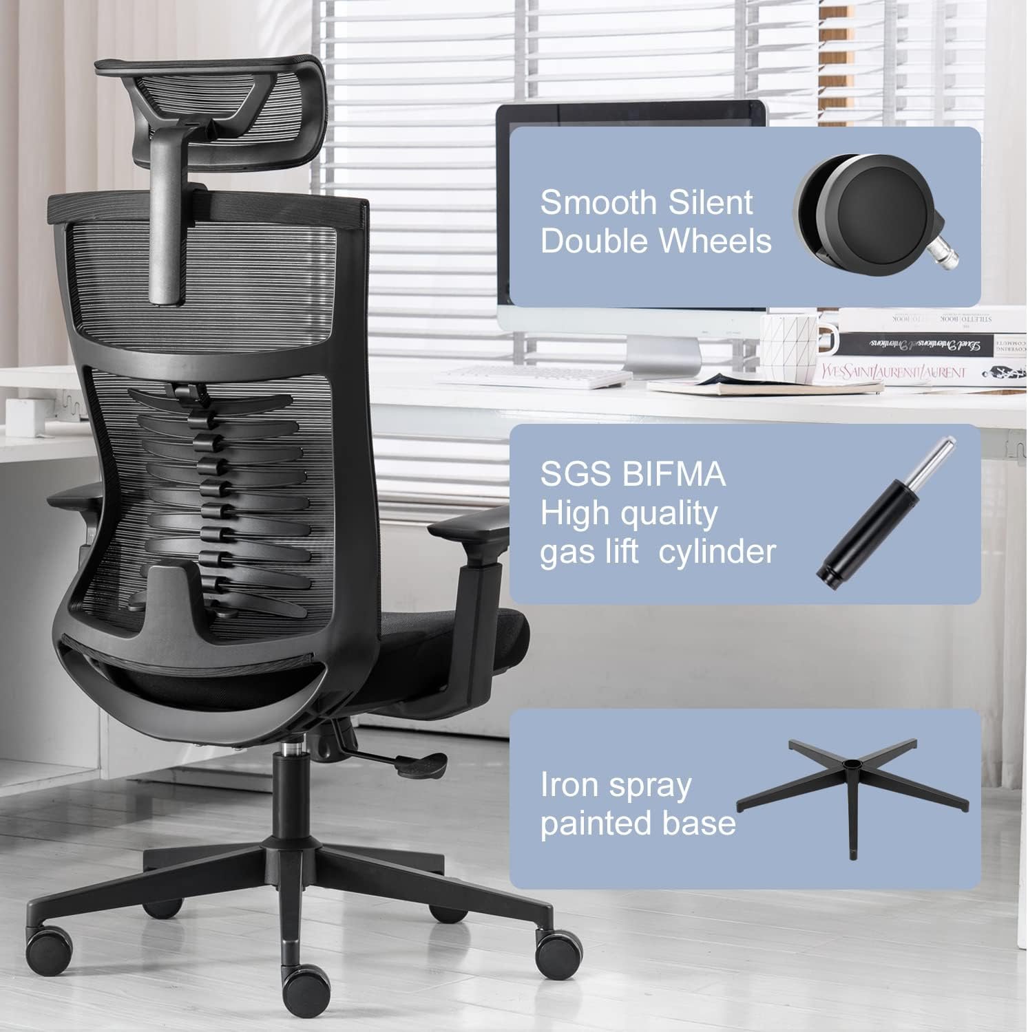 Ergonomic Office Chair, Computer Desk Chair with Adjustable Lumbar Support, Gaming Chair with Adjustable Headrest/PU Armrests, Tilting Big and Tall Mesh Chairs for Home Office, Black