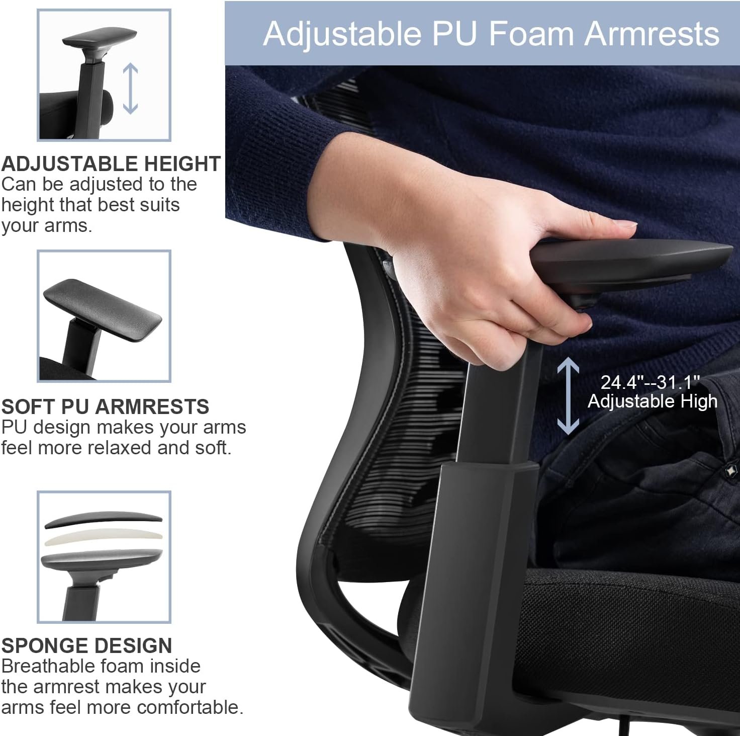 【Adjustable Soft Armrests & Headrest】The armrests of the ergonomic office chair are height-adjustable according to your sitting posture, ranging from 24.4” to 31.1”, which can meet individuals with different needs, allowing you to find the ideal posture for working, studying or relaxing.The headrest of the desk chair can be adjusted up and down, and the angle can also be adjusted to meet different needs to relieve neck pressure.