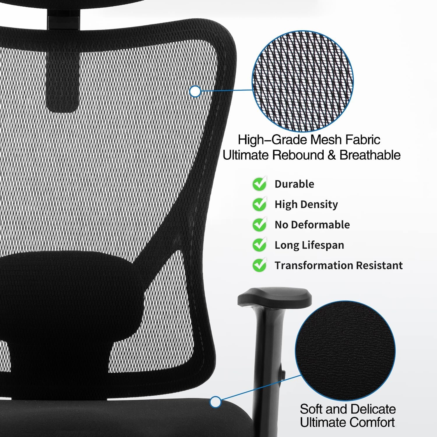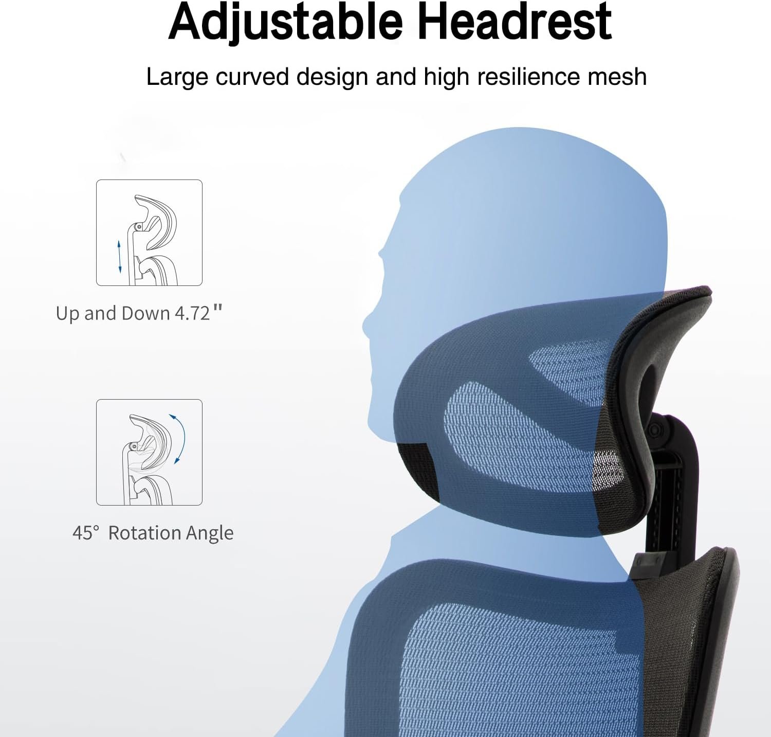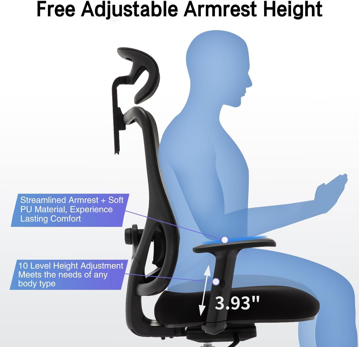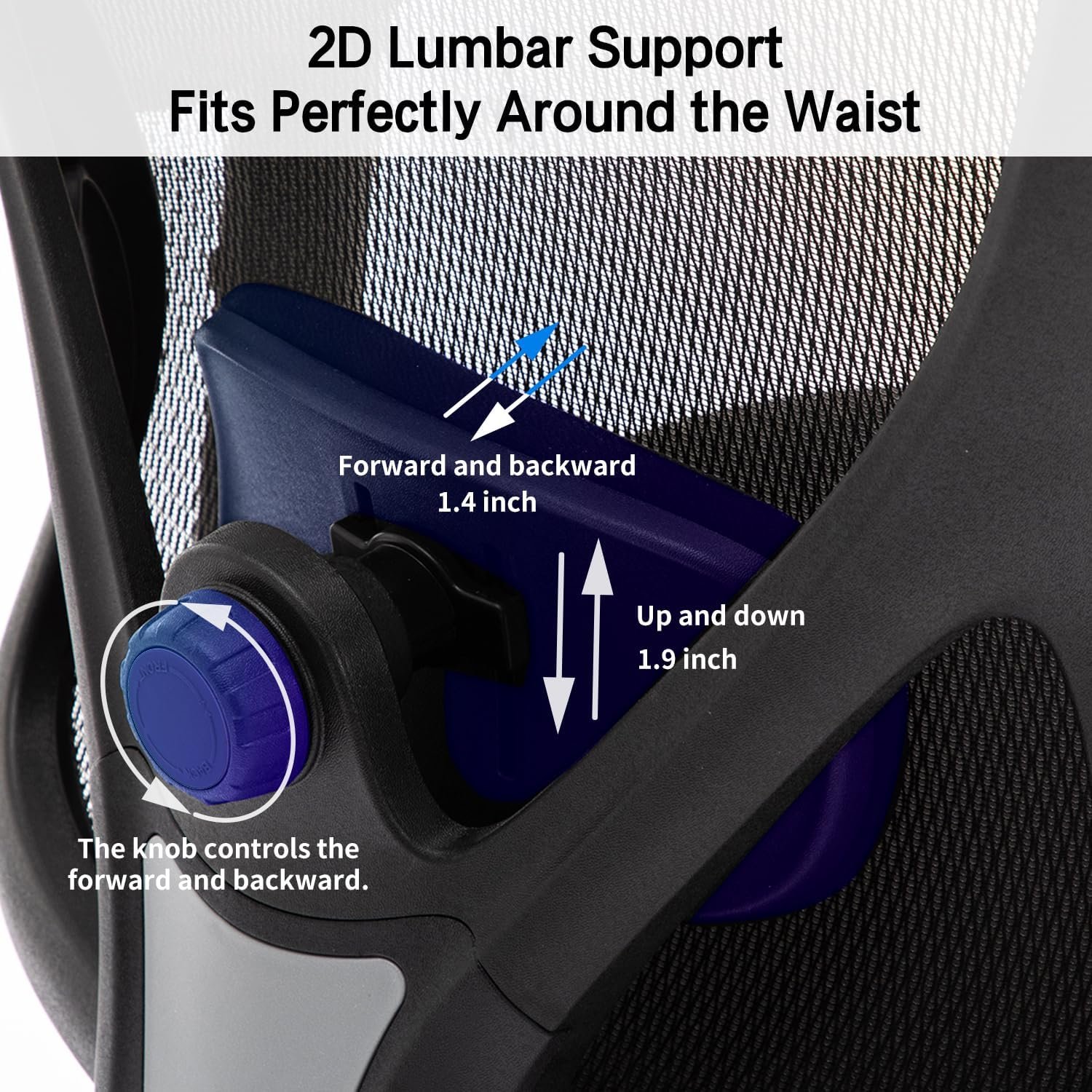 【Comfort】: Our ergonomic office chair uses adjustable (2D large arc headrest) and (2D Lumbar support) to provide all-round support and comfort, promote human blood circulation, reduce fatigue and injury; headrest and backrest with excellent highly elastic breathable mesh, more comfortable and cooler; (4.7in high resilience cushion)with W-shaped and waterfall-edge design, providing larger support area and disperse pressure on hip and thighs,make you more comfortable.
