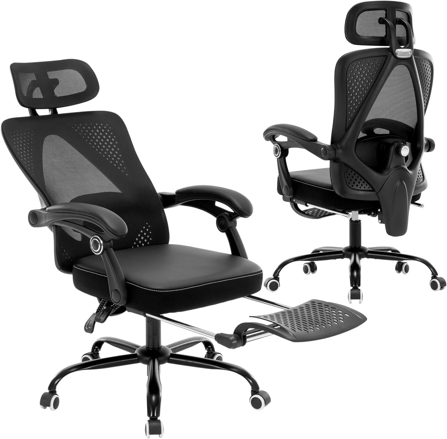 Ergonomic Office Chair, Reclining Desk Chair with Adjustable Lumbar Support, Computer Chair with Headrest/Footrest, PU Leather Home Office Mesh Chairs with Padded Armrests, Black