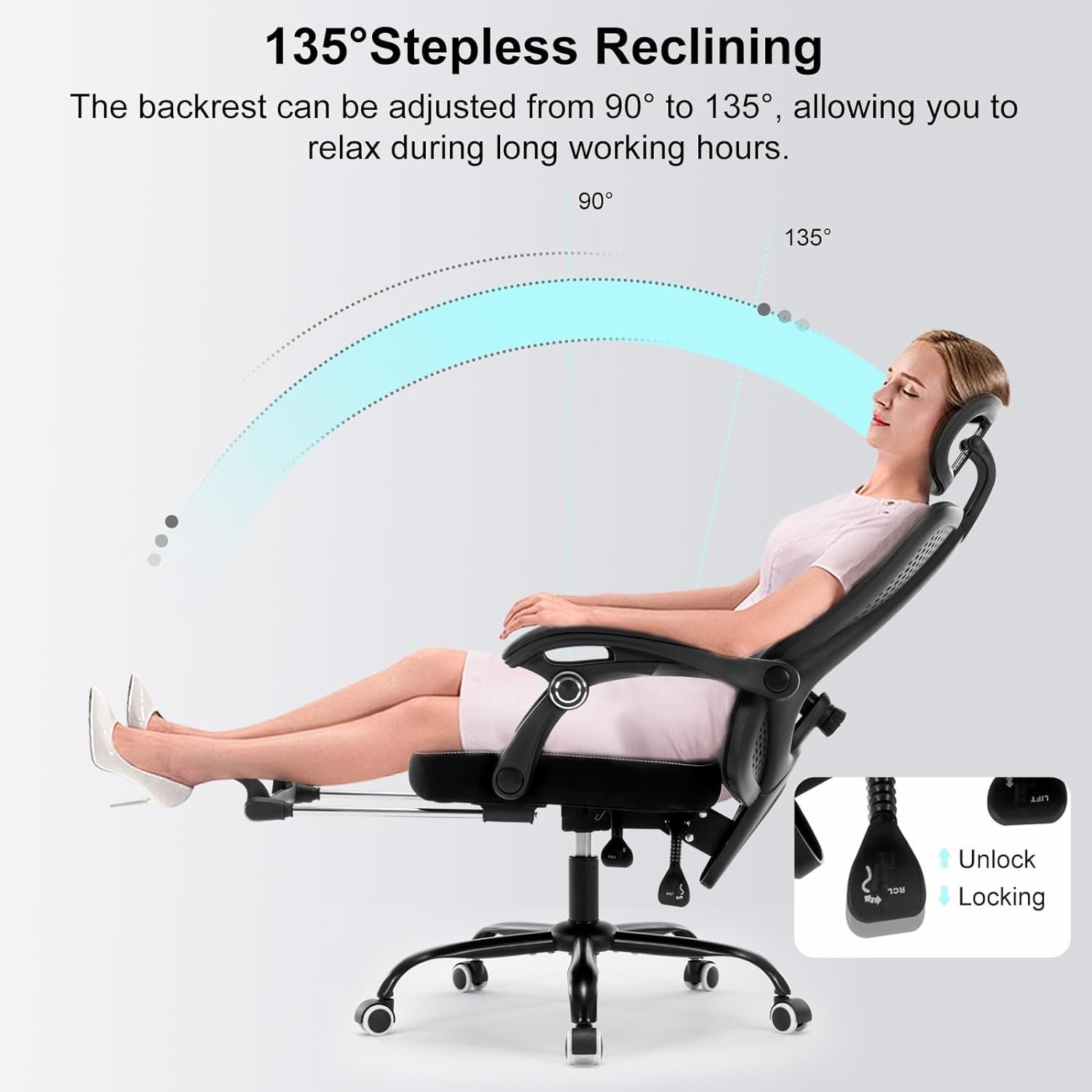 【Lockable Reclining Function】The backrest of this computer desk chair can be tilted backwards with a recline range of 90° to 135°, You can recline at any angle within the range and lock the position.It allows you to relax from your busy schedule, you can also change the relaxation mode during your lunch break or at work.