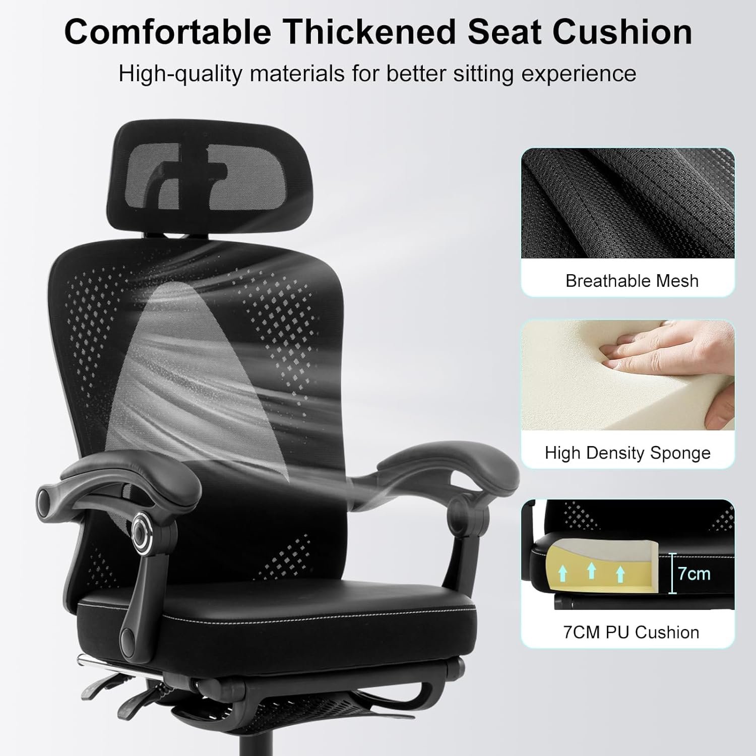 【Comfortable Seat & Padded Armrests】This home office desk chair is made of high-quality breathable mesh, and the 7cm thick cushion is made of PU Leather and high-density foam to relieve pressure and provide comfort, which is soft and firm and not easily deformed for long time use. The padded armrests help to reduce upper body tension and allow the shoulders and arms to relax.
