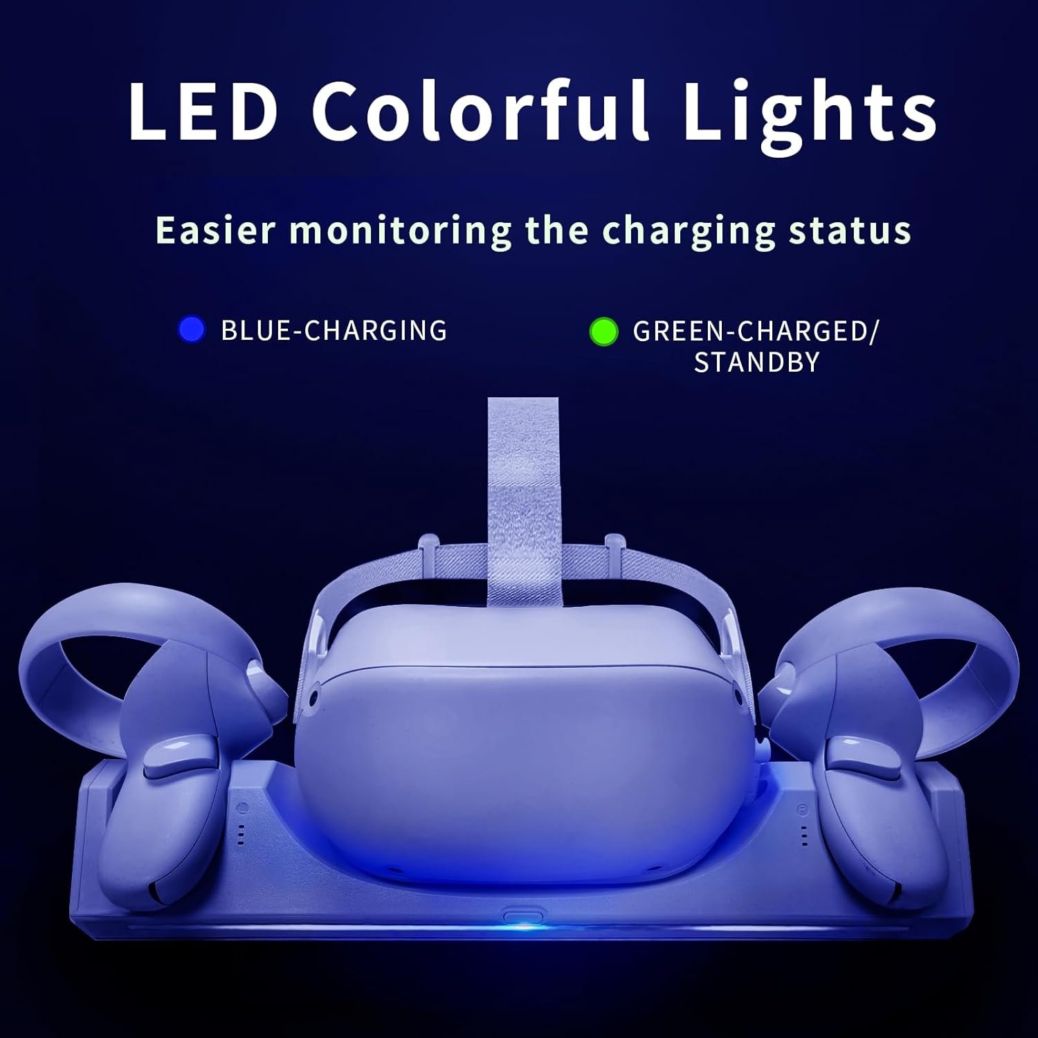 【Stylish LED Indicator Light】The VR charging dock is designed with LED lights to indicate the charging status of the headset and touch controllers. The charging station is red when charging and blue when fully charged, with an adjustment button in the middle, you can turn off the LED light while sleeping, and the charging stand will keep charging.
