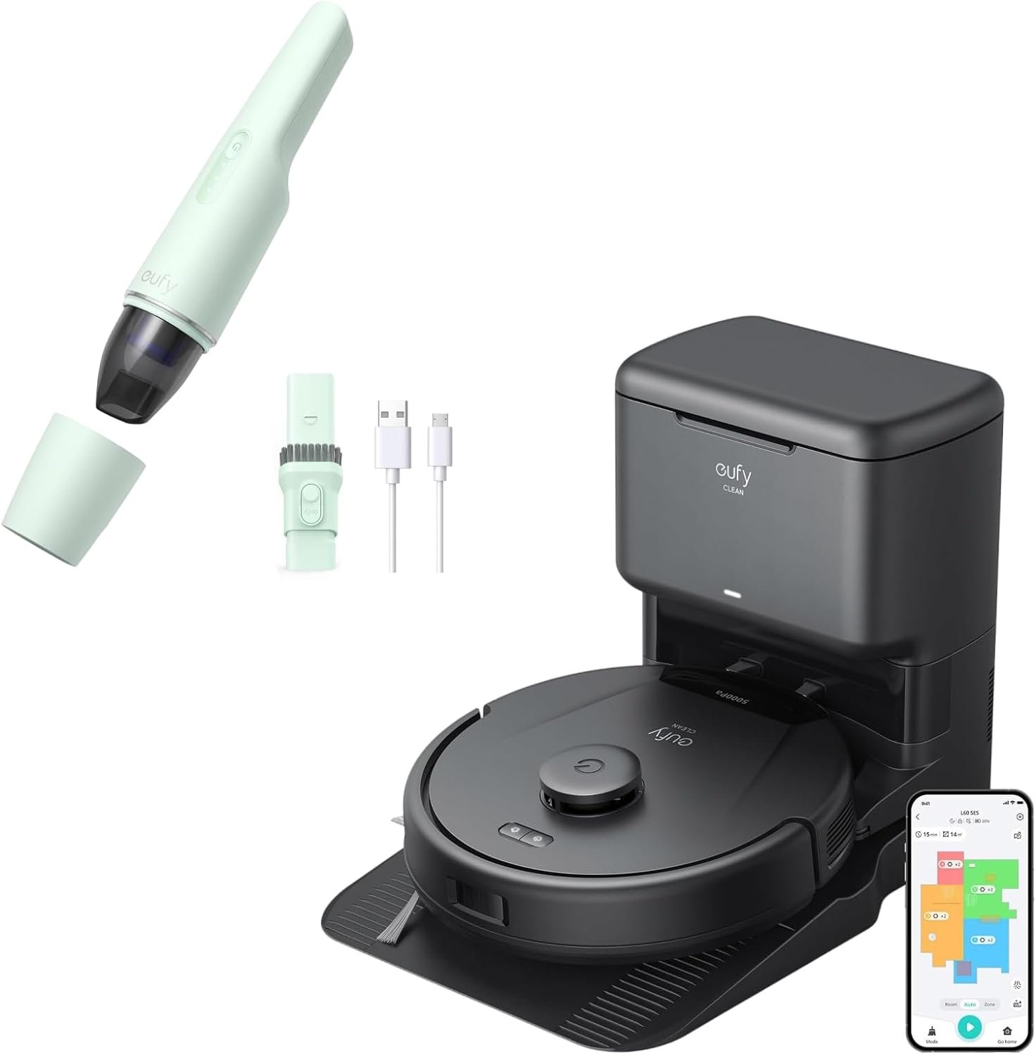 “You can get a eufy L60 Hybrid Robot Vacuum with Self Empty Station and a HomeVac H11,Cordless Handheld Vacuum Cleaner by purchasing the buddle. Up to 60 Days* of Hands-Free Cleaning: 17,000 Pa of suction draws dust and debris out of L60’s dust bin and transfers it to a 2.5 L dust bag in the Self-Empty Station. Thanks to the large capacity, you can wait up to 60 days before replacing. Ultra-Strong 5,000 Pa Suction: Hair, crumbs, and dust are removed easily in just one pass for cleaner floors. Precision Mapping for Efficient Navigation: iPath Laser Navigation uses advanced Lidar technology to scan rooms and create accurate maps, resulting in efficient cleaning routes around your home. Lightweight and Compact: Completely cordless, weighing just 1.2lbs, and being roughly the size of a wine bottle. Cleaning is made effortless and storage is made simple. Dust Devouring Suction: With 5500Pa of power, you can suck up every spec in seconds when everyday mess is made.”