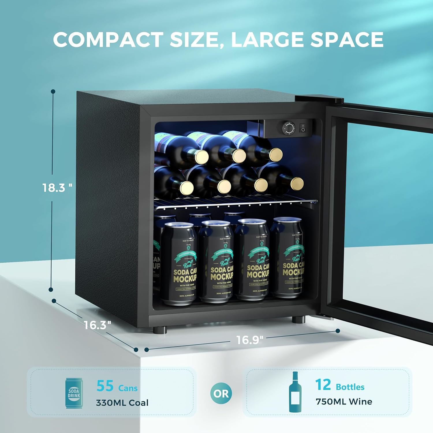 PORTABLE DESIGN-The beverage fridge is compact and takes up very little space, so it can be placed on the bedside, counter or wall corner, and its stylish appearance matches most indoor and outdoor décor styles. Inside, the mini fridge glass door has a 1.3cuft capacity and can hold up to 55 cans of beer.