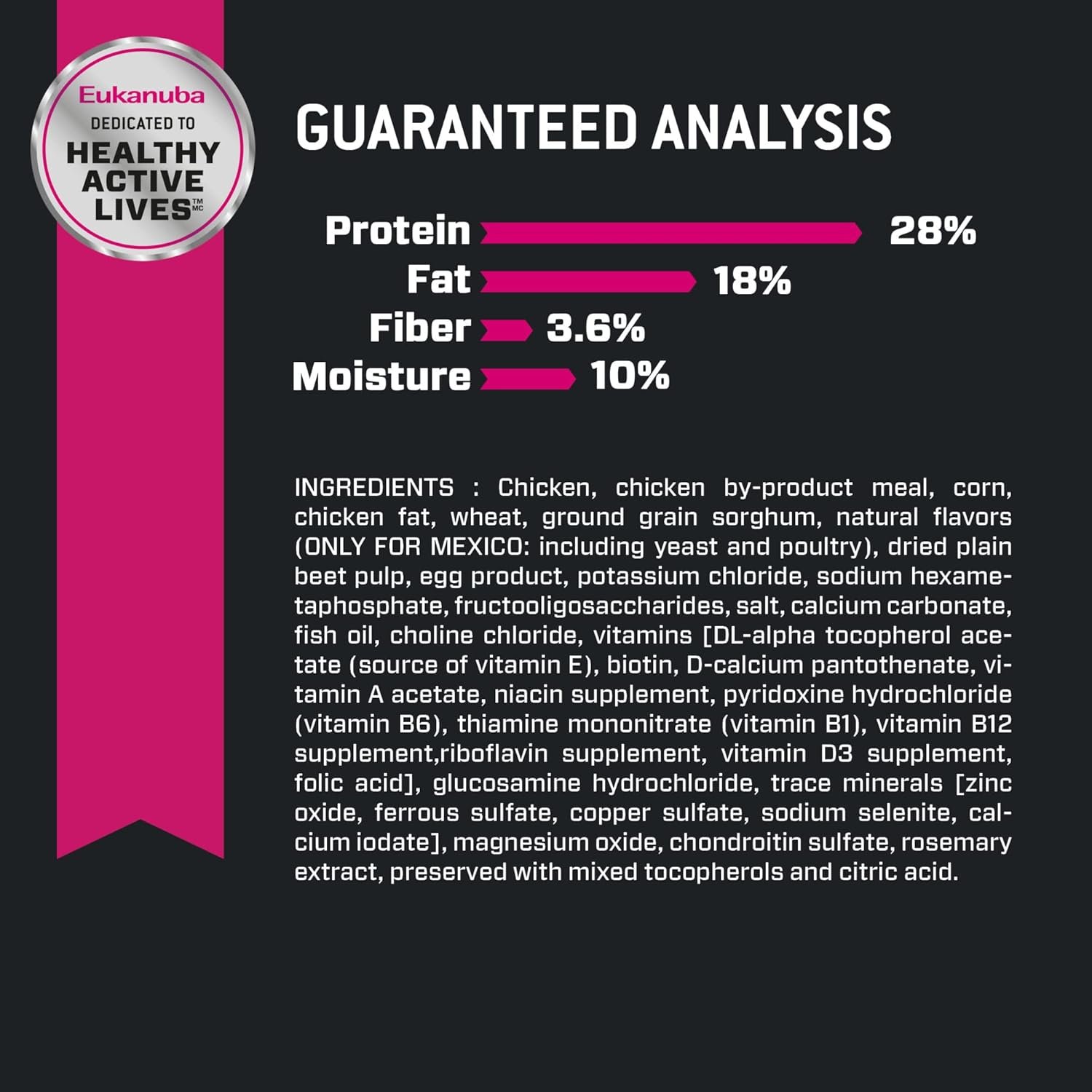 Promotes lean muscle development and joint health in active adult dogs with a combination of animal protein, glucosamine, and chondroitin sulfate