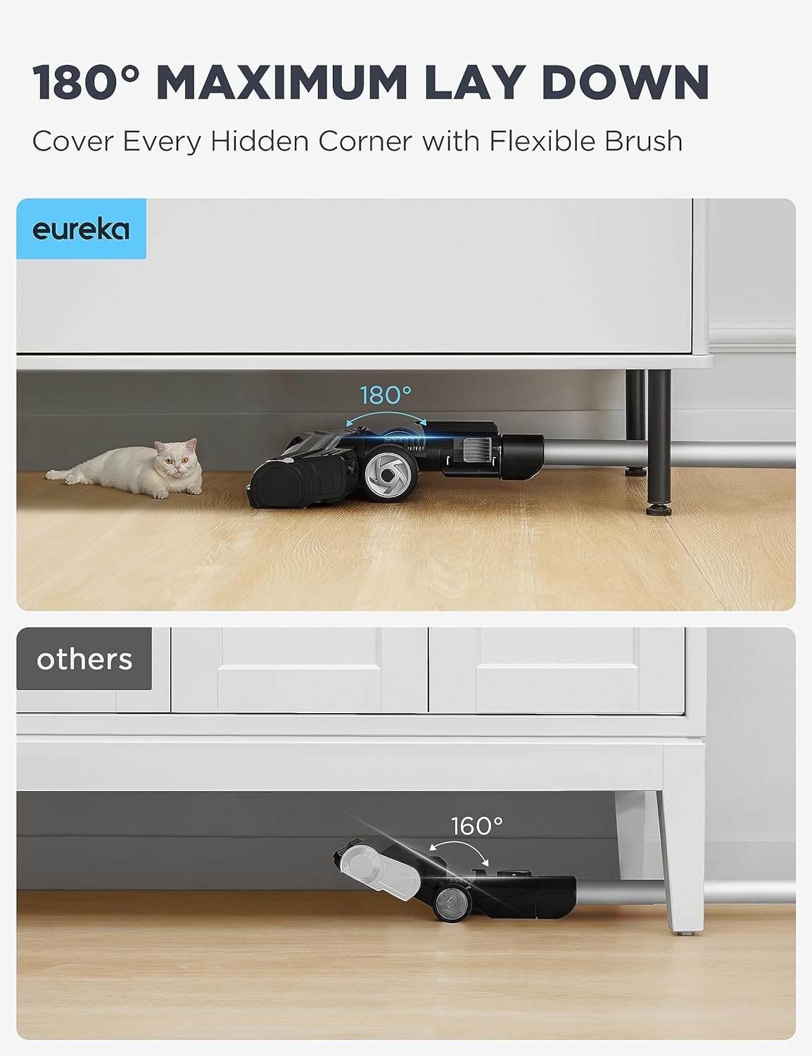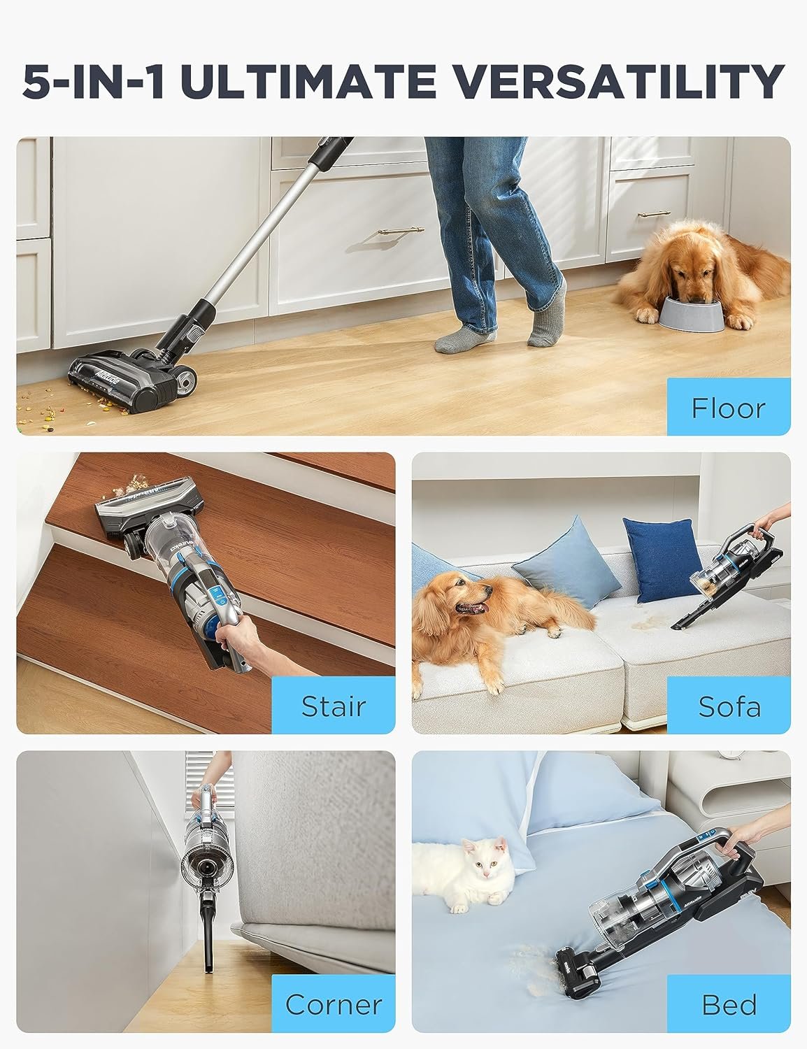 【Ideal For Pet Family】The specially designed motorized pet tool, with de-tangling brush deep cleans long hair and pet hair on carpets and hard floors. The flexible self-adaptive swivel head effectively fix on uneven surfaces, which is conducive to tackle dust, debris, and hair. Meanwhile, its independent motor provides extra suction power for difficult-to-clean items such as cat litter and food.