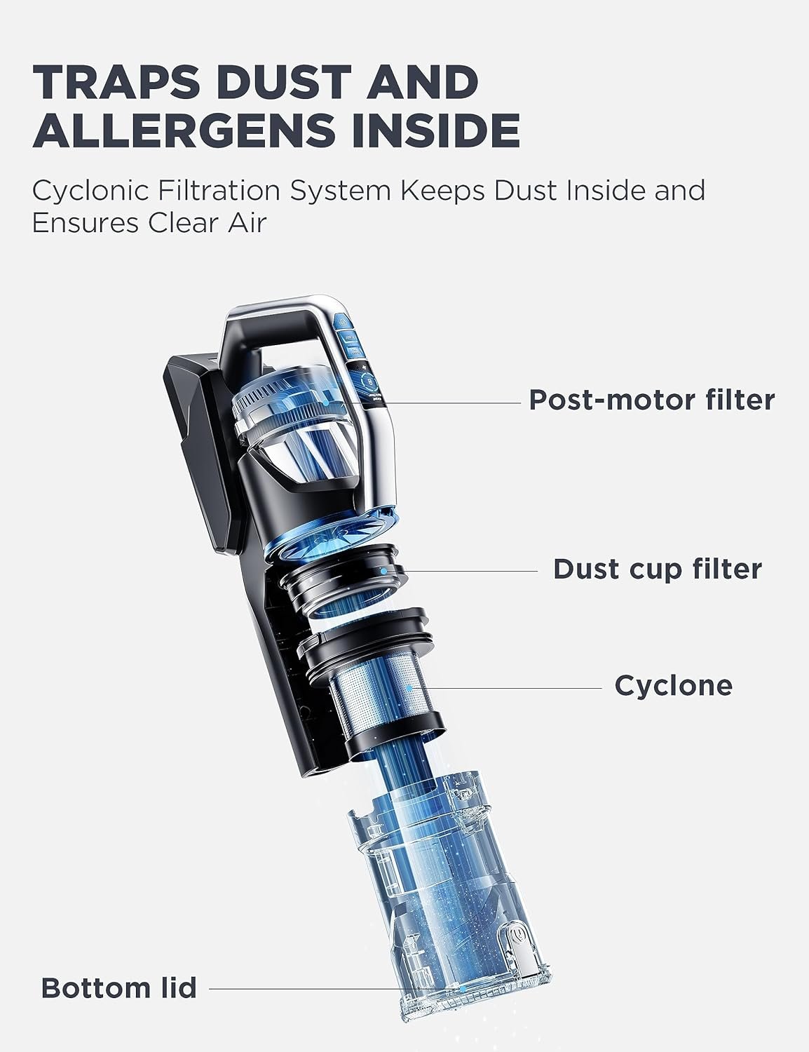 【Dirty In, Fresh Out!】The advanced cyclonic filtration system effectively isolates dust inside and ensures a fresh environment. Capable of trapping even the smallest particles and preventing them from being released back into the air.