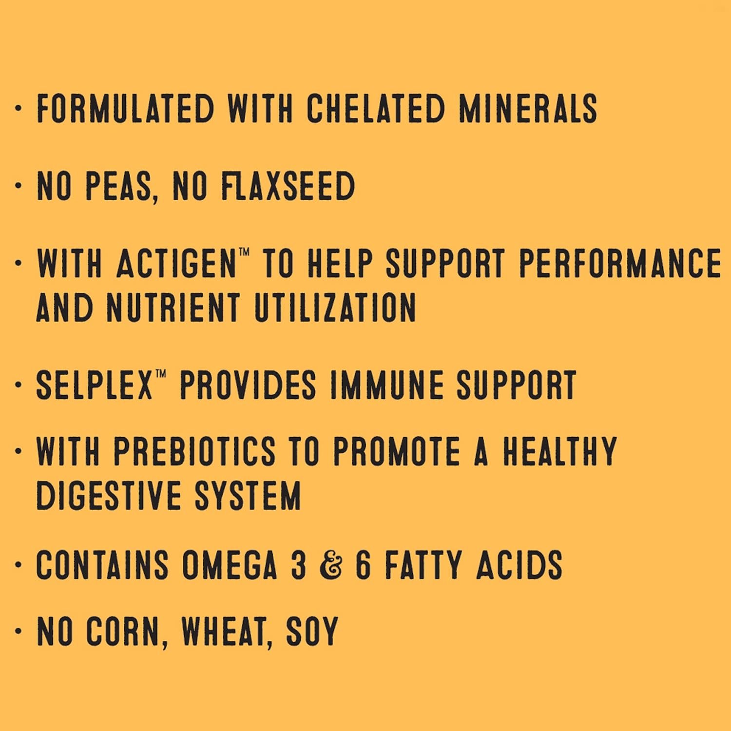 Gluten-free recipe is fortified with prebiotic. Chelated minerals and alltech ingredients like lactosacc for an optimal digestive system. , actives to help support performance and nutrient utilization, and selplex for immune support.