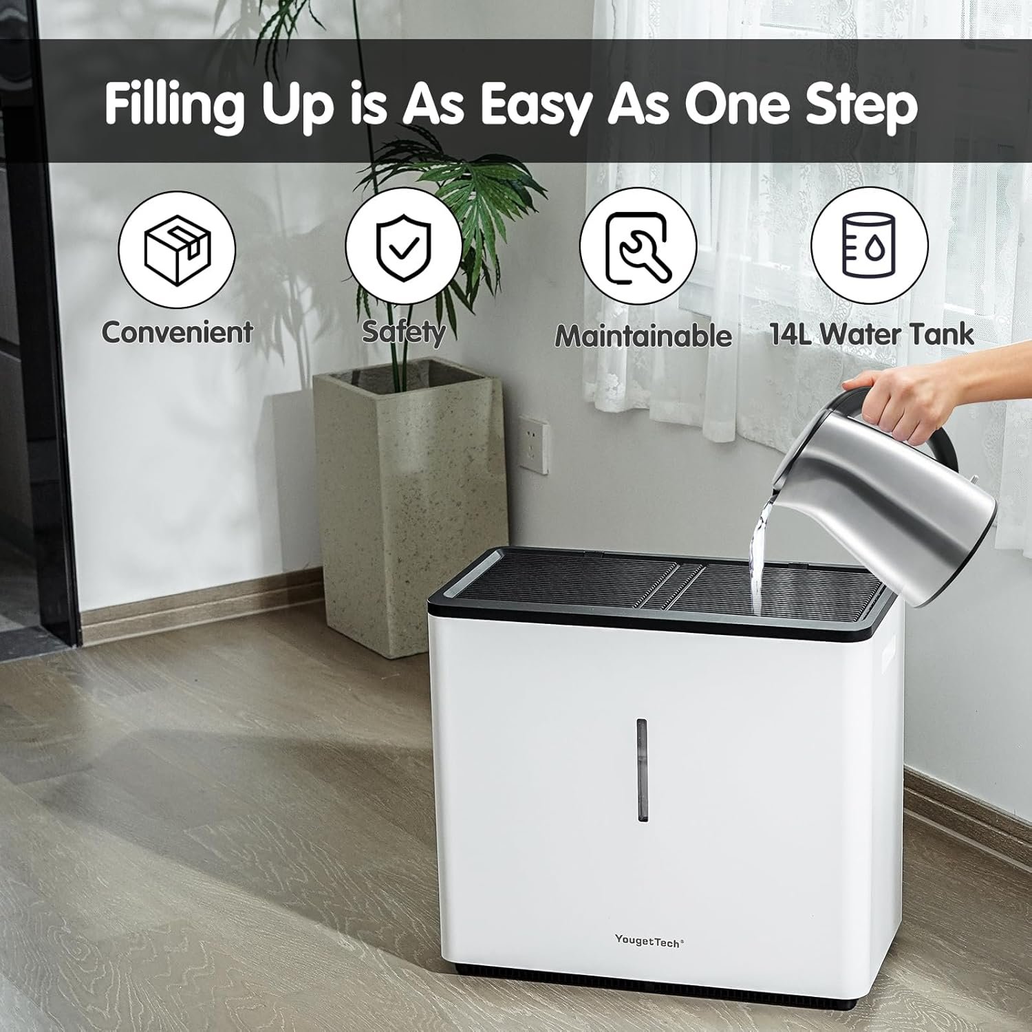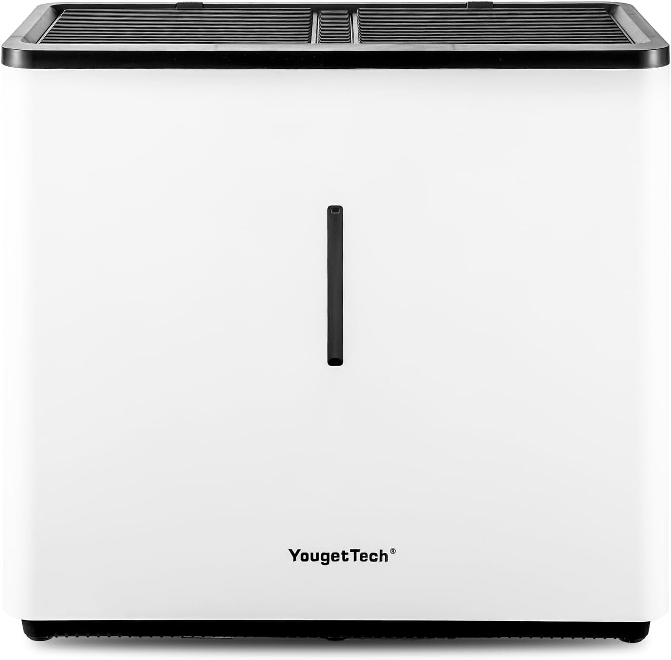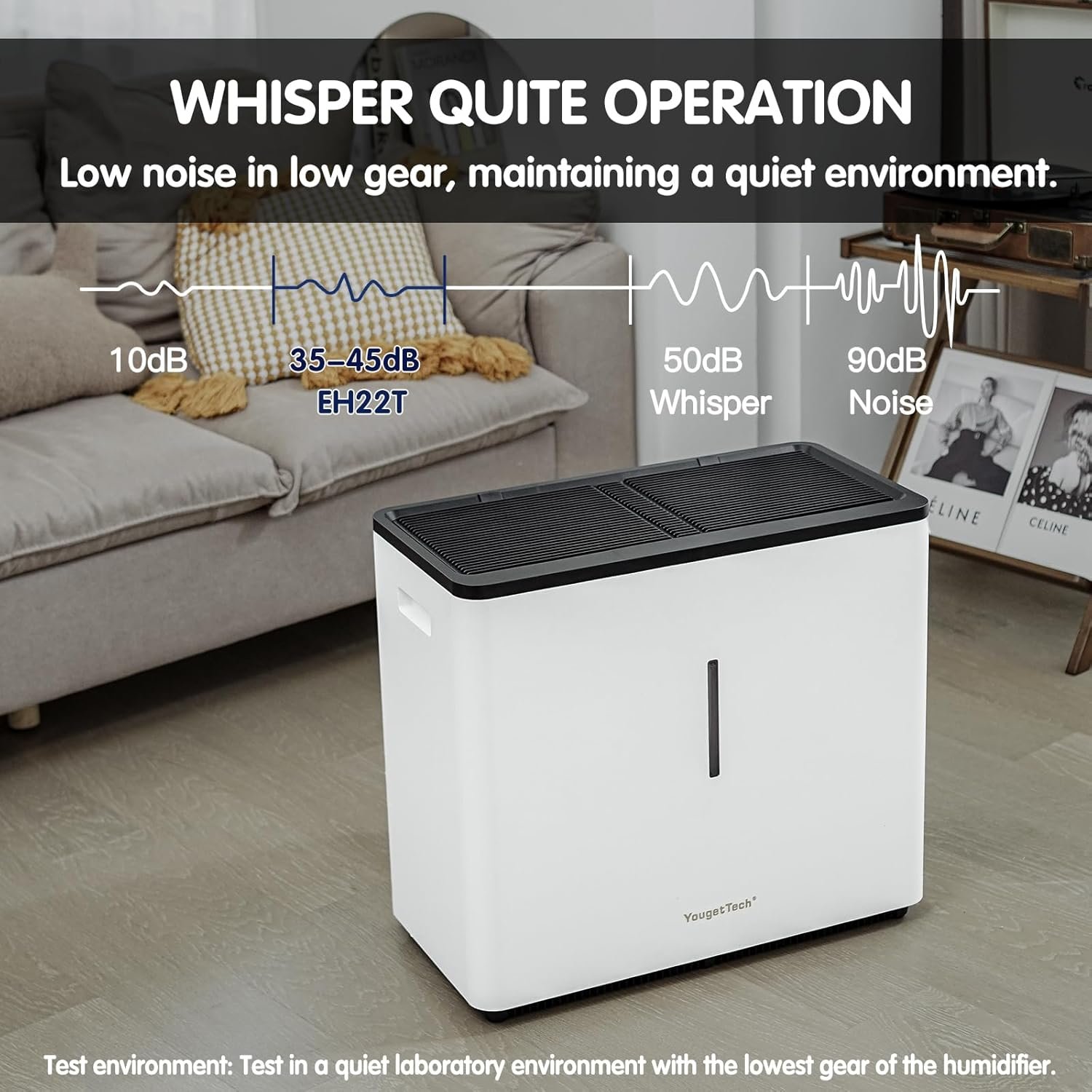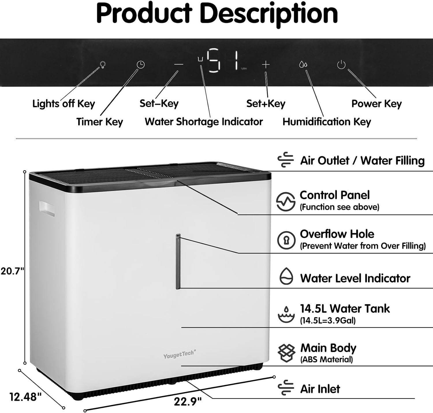 [14.5L WATER TANK & TOP FILLING] YougetTech Evaporative Humidifier is equipped with a large 14.5L(3.9Gal) water tank, reducing the need for frequent refilling and providing longer-lasting humidification. The humidifier could work for 10+ hours without refilling in low speed mode. With top filling design, there’s no need to disassemble the water tank, saving time and effort. The transparent water level indicator window allows you to check the water level at any time.