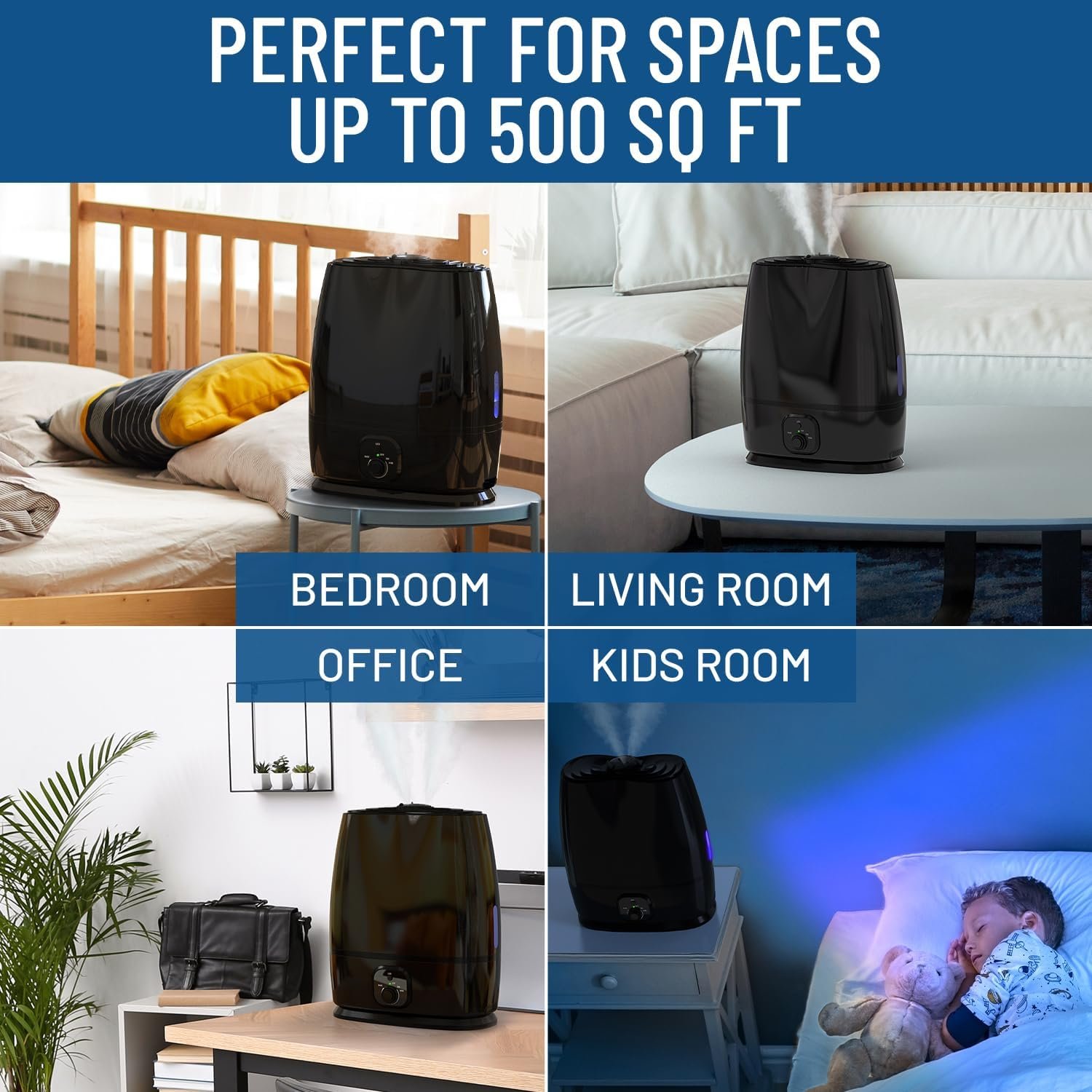 PERFECT FOR ANY ROOM UP TO 500 SQUARE FEET: Create an oasis of comfort in any space with our room humidifier, suitable for spaces up to 500 sq ft, ideal for large bedrooms, kid’s rooms, nurseries, and living areas.