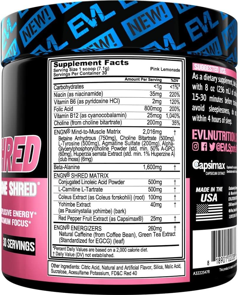 Science Based Formula – Try the ENGN Shred pre-workout energy and fat burner support powder with exclusive ingredients including Beta alanine Agmatine Huperzine A L-Carnitine Yohimbe CLA and much more