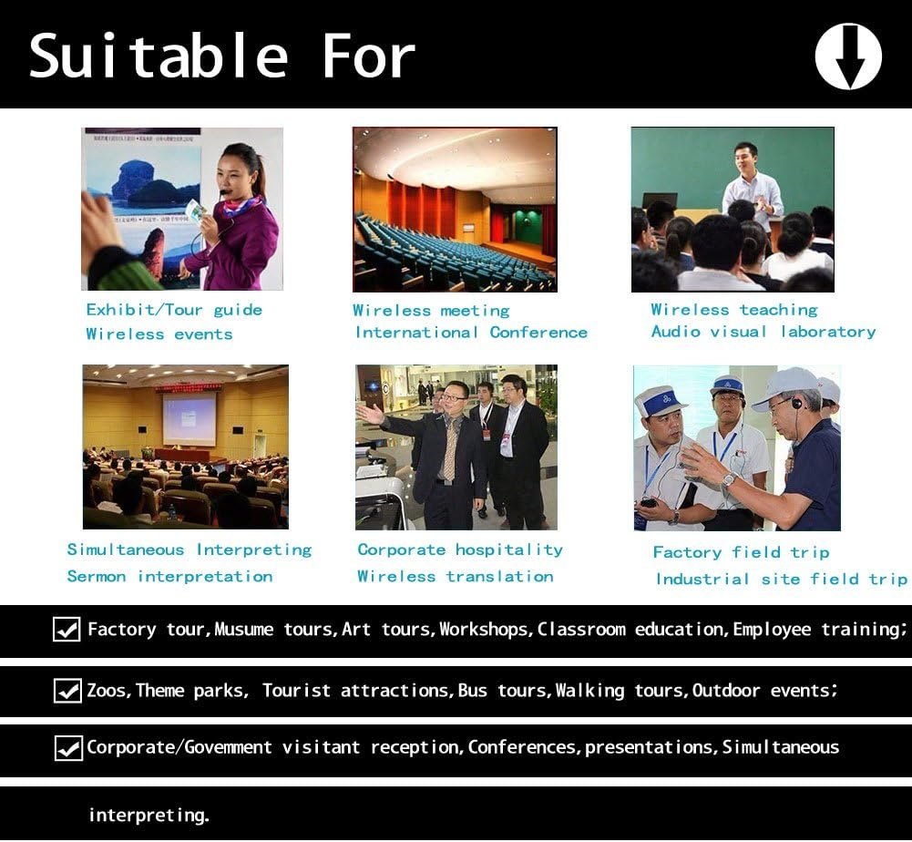 Enjoy your travel with EXMAX wireless tour guide system, the tour guide can speak comfortably without shouting or distracting others nearby. Meanwhile, visitors enjoy a better experience—no more confusion or straining to understand.With our lightweight audio guide systems, you can count on crisp, clear sound performance. Overcome noise and distance issues and make sure your message is heard. Widely uses for: Tour guiding, wireless meeting, wireless teaching ,Simultaneous Interpreting,corporate hospitality,Factory tour,field interpretation,Governmental Agencies,Houses of Worship,Conventions and Auditoriums, factory field trip, a walking tour, an exhibit guide, industrial site field trip, sermon interpretation, work-study programs, international conferences, translation guide, school audio visual laboratory, events for communities, family restaurants,Sale presentations,trade show, corporation event, any group setting…etc.