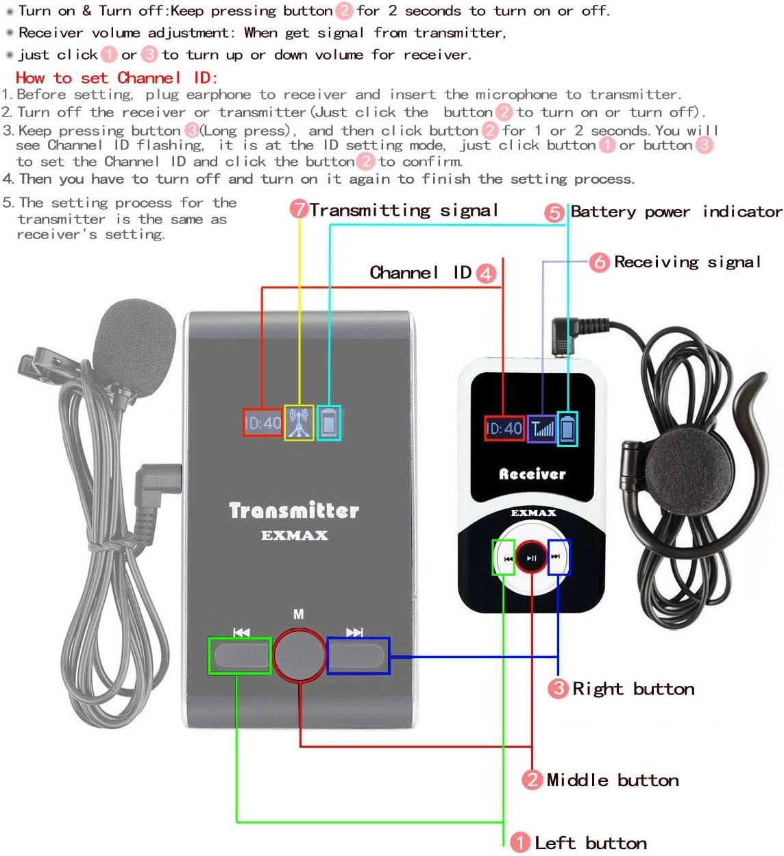 The wire of microphone and earphone has antenna function, please do unfold the wire of the microphone and earphone to enhance the voice signal transmission. On each group, transmitter and receivers should be set on the same frequency Channel ID,for example, Group A: transmitter A is set on Channel ID 05, so receivers A should be set on Channel ID 05 accordingly.But different groups should use different frequency Channel ID, so they will not interfere with each other when work simultaneously.