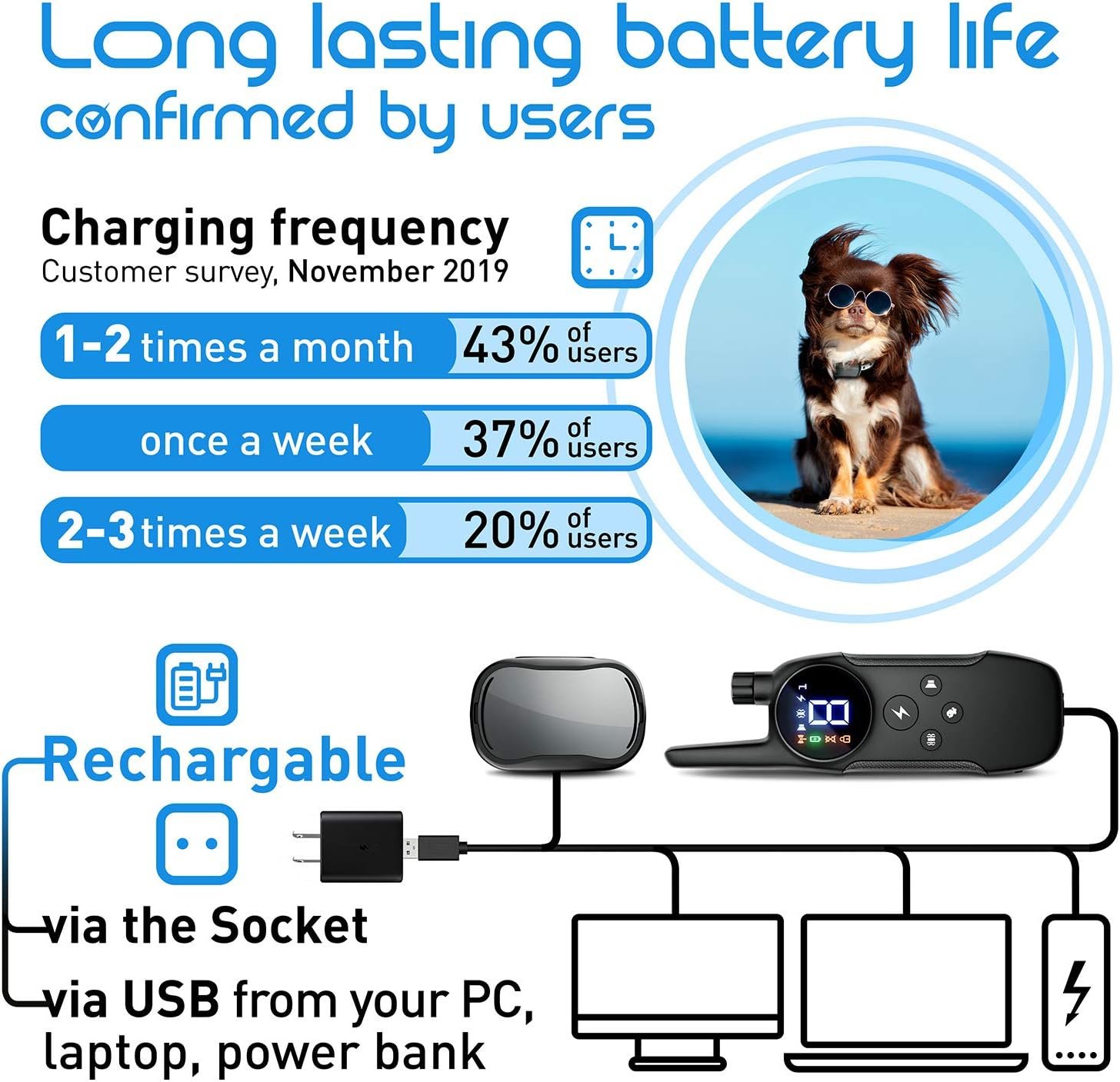 Only Need To Charge Once Per Week – Long lasting lithium ion battery means with normal use, you only need to charge the collar once a week. Plus the remote fits easily in your pocket so you can take it with you. Comes with battery saving standby mode