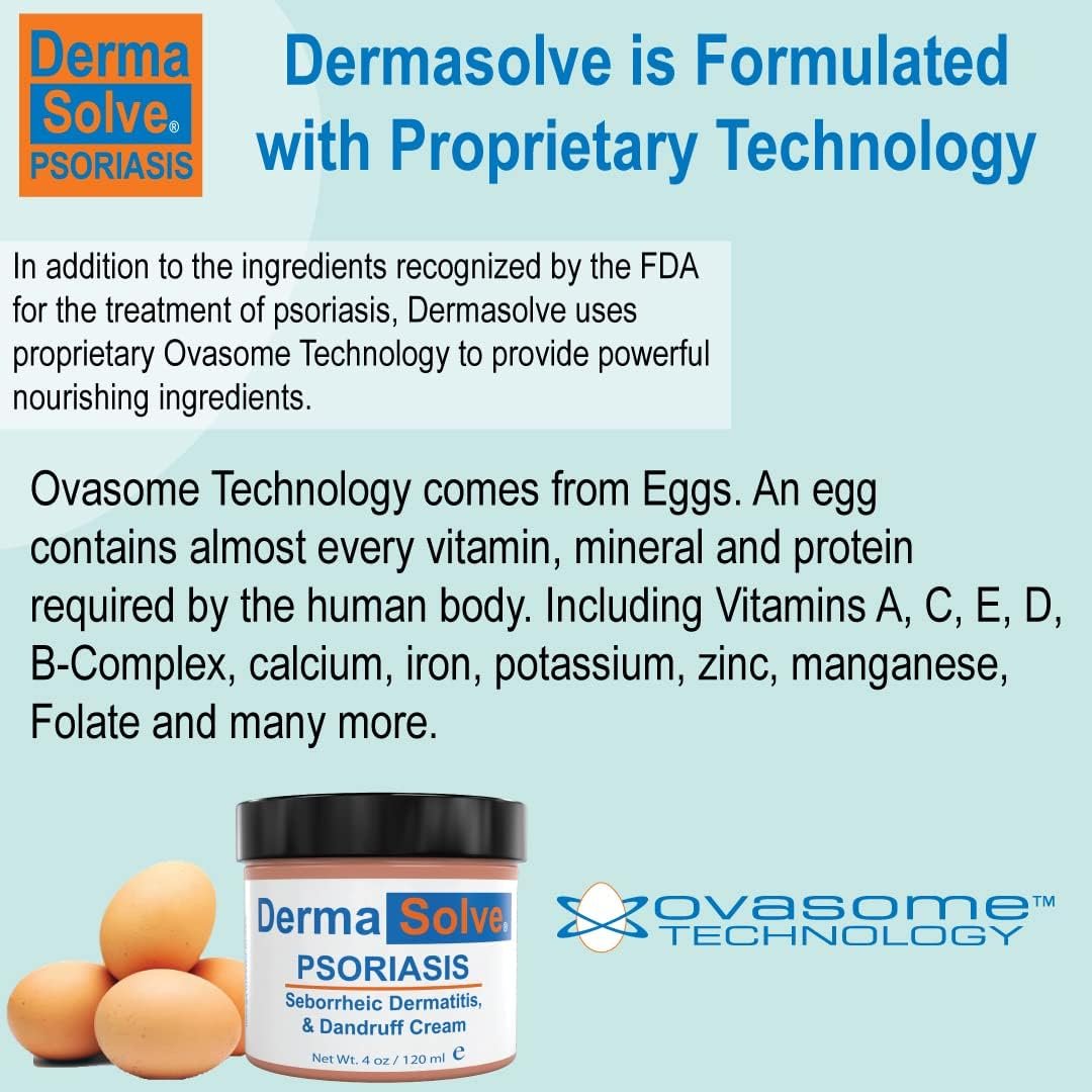 Dermsolve Medicated Psoriasis Cream helps eliminate the symptoms associated with Psoriasis, and other dry skin conditions. Dermasolve uses 1.8 percent salicylic acid to gently exfoliate dry skin cell build-up. It provides the body with over 70 different vitamins, minerals, and proteins all sourced naturally using proprietary Ovasome Technology. This unique nourishment provides the body with everything it needs to heal and look normal again. No longer will you be left with those embarrassing red blotches.