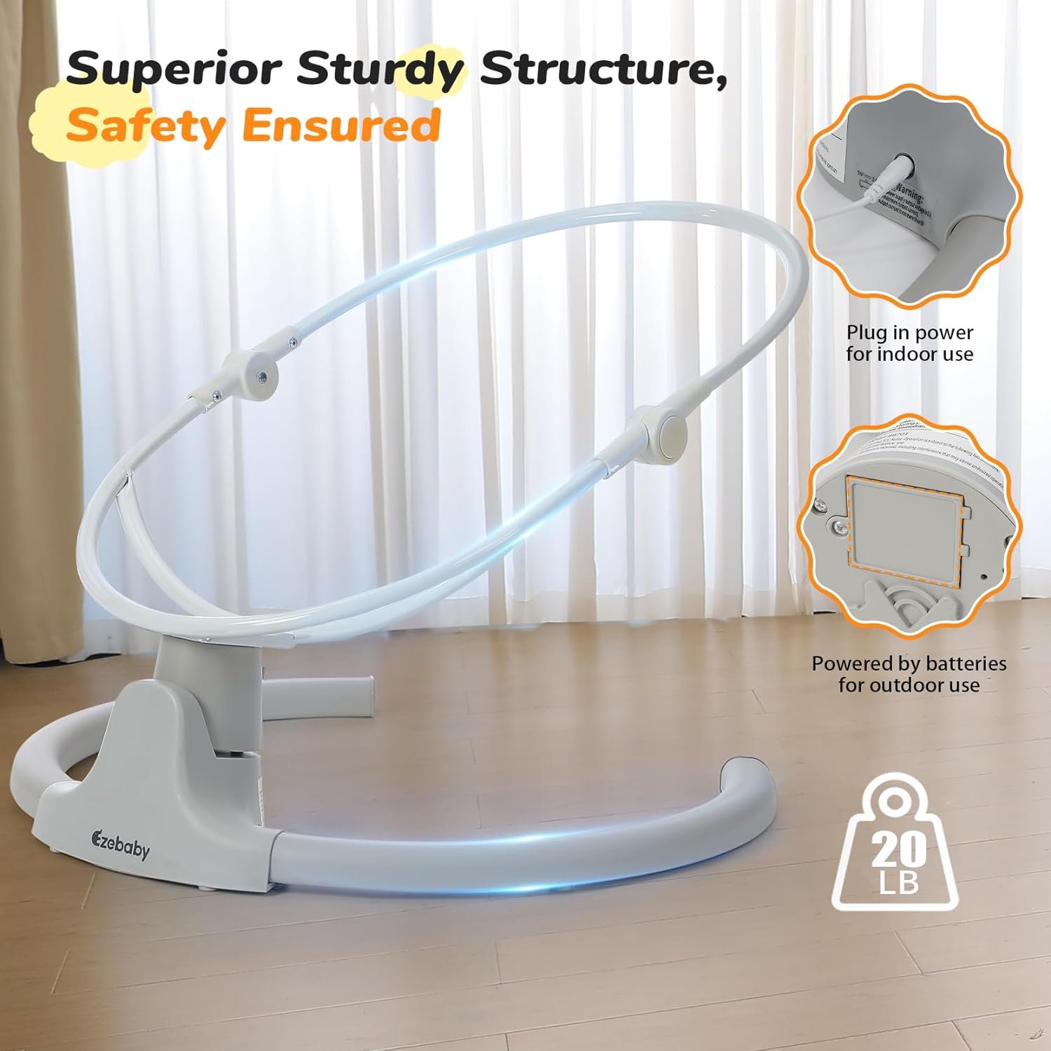 [Easy assembly & Portability] – Setting up the newborn swing is quick and simple, and it can be conveniently disassembled for storage or transportation. It can be powered by batteries (not included) for outdoor use or easily plugged in for indoor use, adding to its portability as an portable baby swing.
