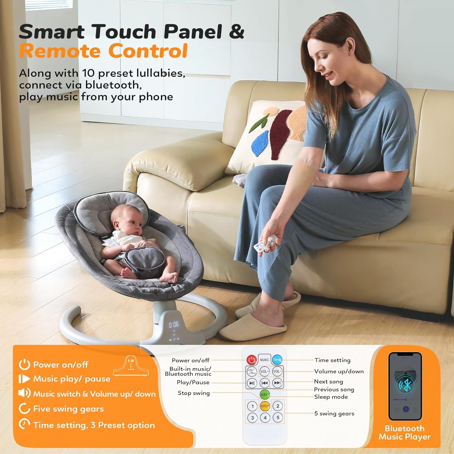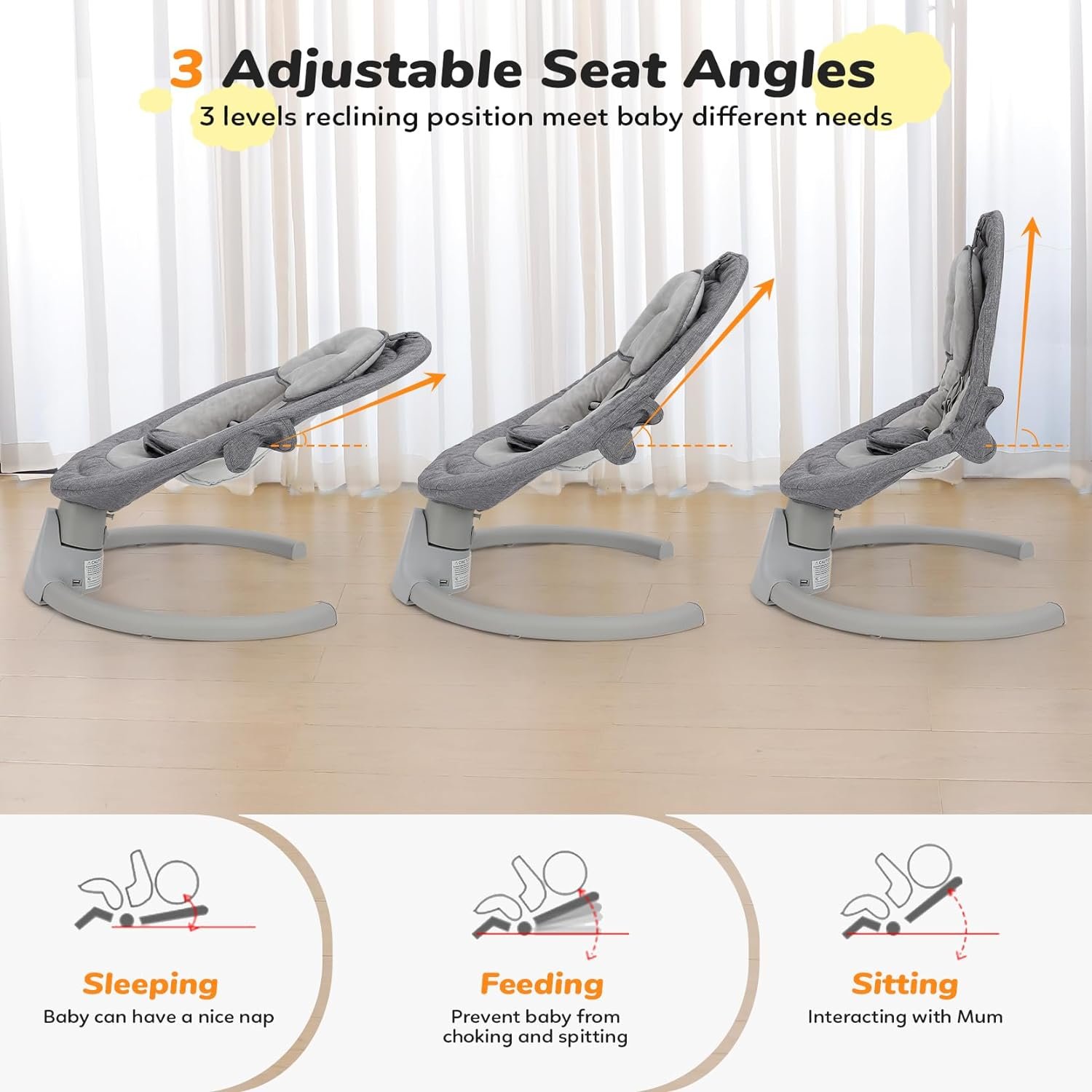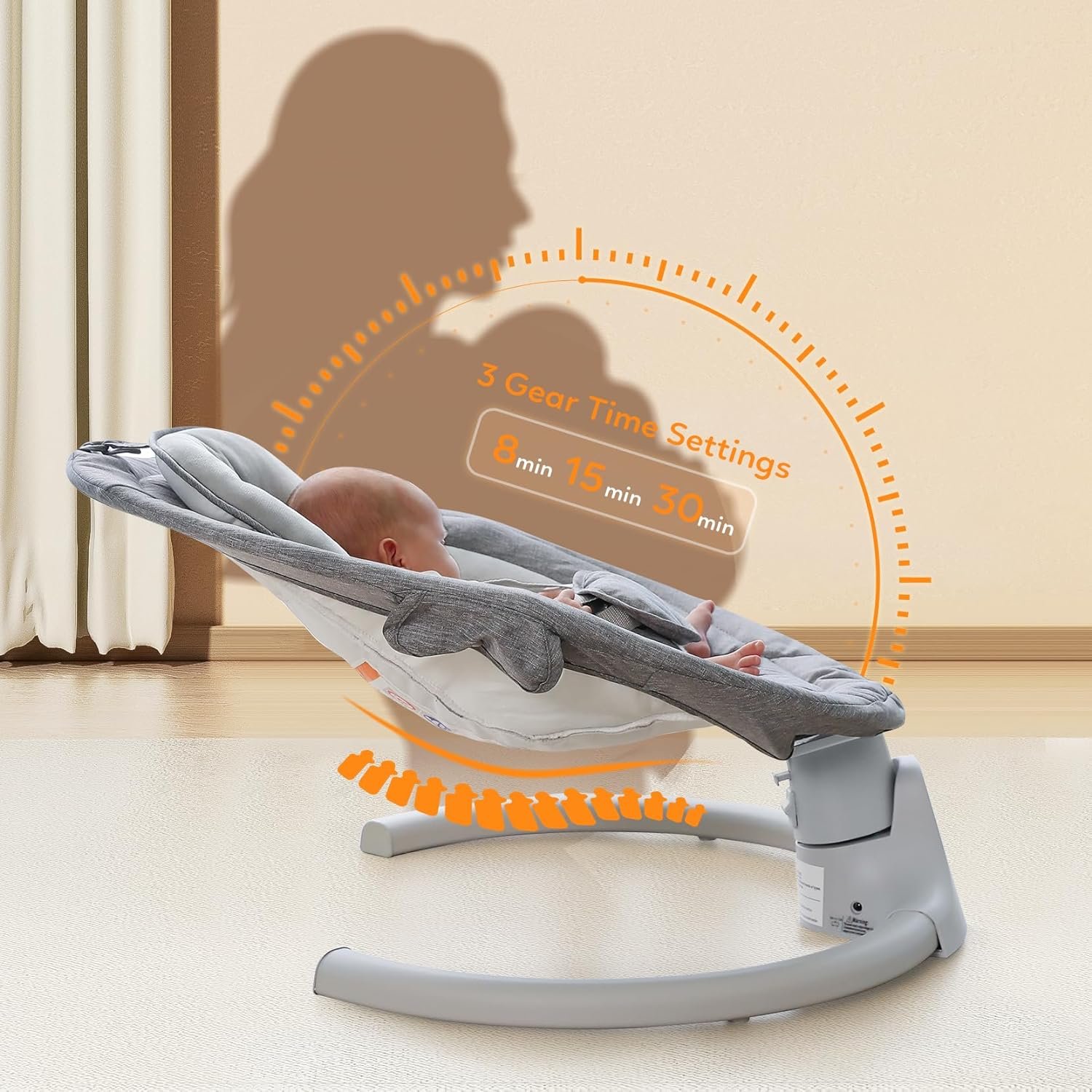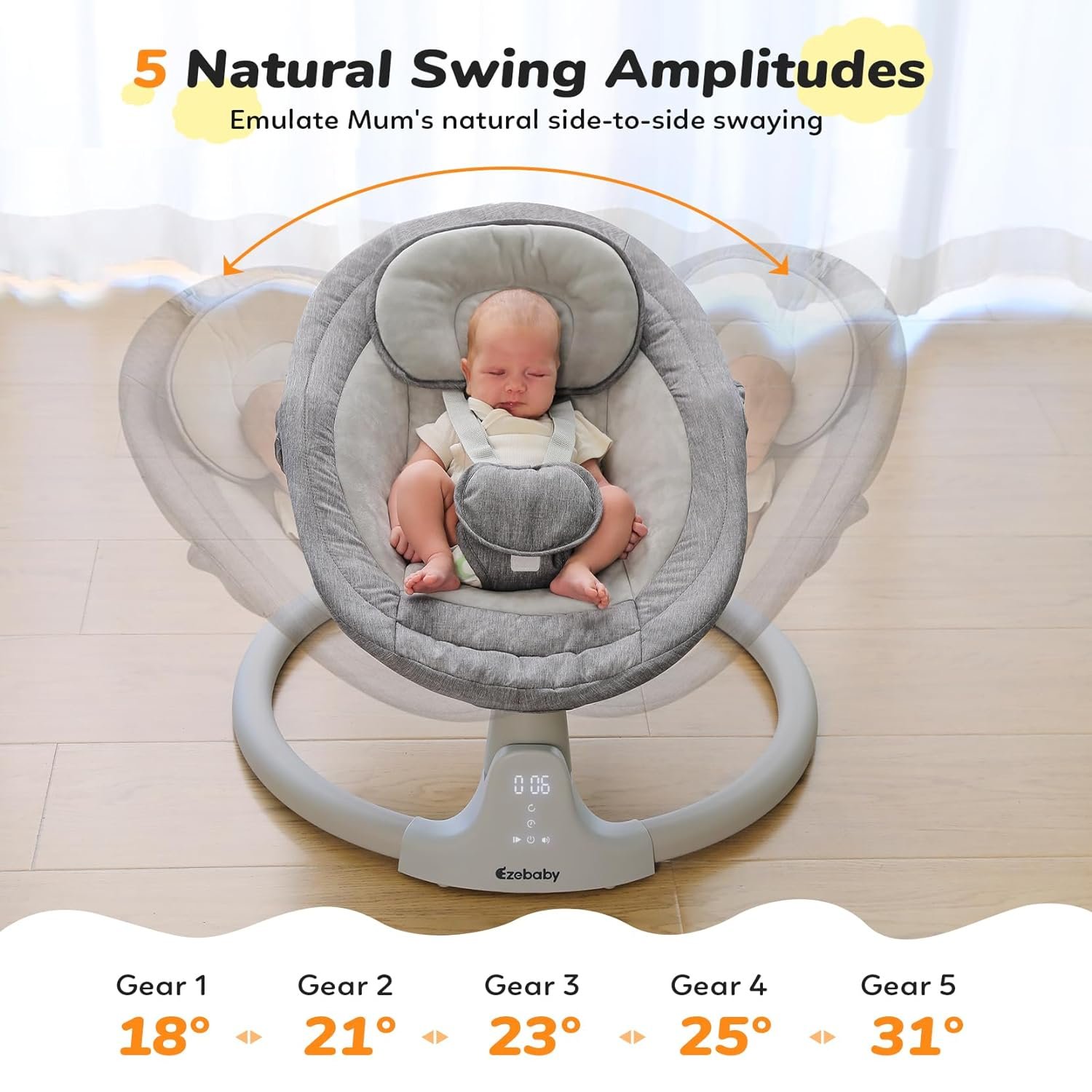 [Hands-free parenting] – Emulating the gentle swaying motion of parents’ arms, our baby swing effectively soothes and calms your baby, allowing you to have hands-free moments. It is a valuable tool for new moms, enabling them to multitask while ensuring their baby’s utmost comfort and safety.