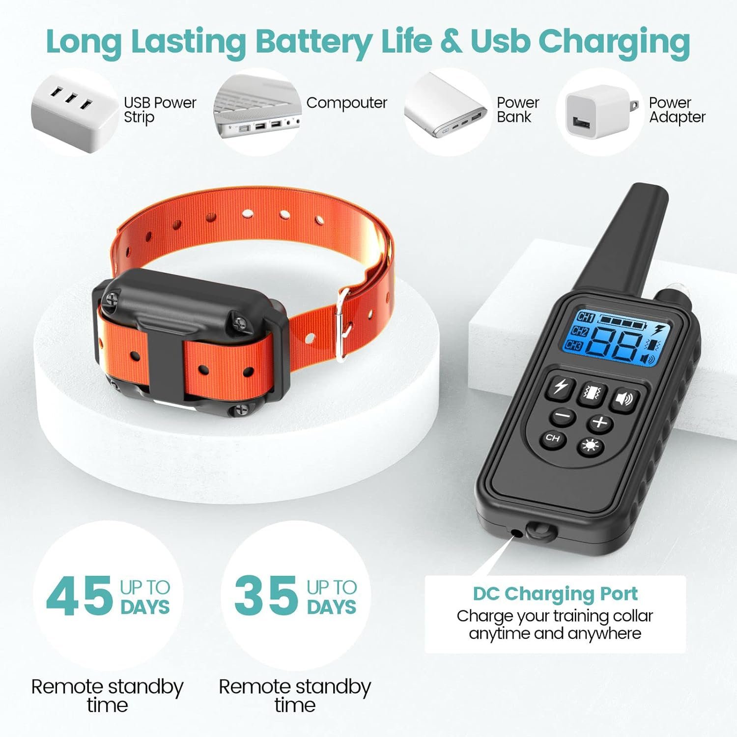 【Quick Charging & Long Lasting Battery】Both Receiver and Remote can be Fully Recharged within 2 Hours by Phone Adapter and USB Outlet of the DC/Power Bank/Computer. The Remote can Last up to 45 Days of Standby Time and Electric Dog Collar 35 Days
