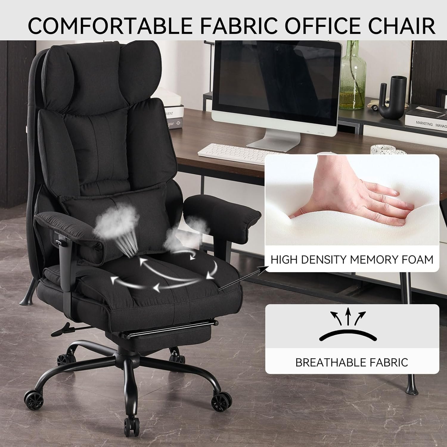 Ergonomic Comfort & Support: Experience unparalleled comfort with our home office chair, featuring a dual-layer high-density memory foam cushion and an ergonomic, wide backrest with lumbar support. Designed for prolonged work or study sessions, this wide office chair unique saddle-shaped seat and breathable fabric ensure a comfortable sitting experience, supporting up to 400 pounds