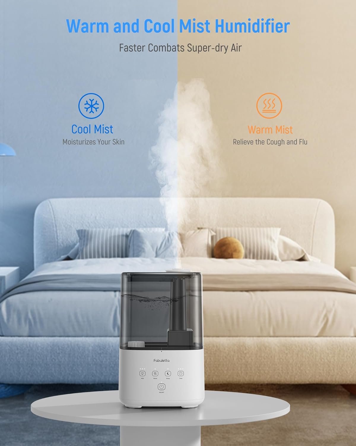 【Warm and Cool Mist Humidifier】: Experience the versatility of FABULETTA Humidifiers for home with both warm and cool mist options, easily switchable with a simple touch. In chilly and dry weather, warm mist diffuses faster, making it perfect for maintaining humidity in large rooms day and night. Create a comfortable and pleasant environment with this dual function humidifier.